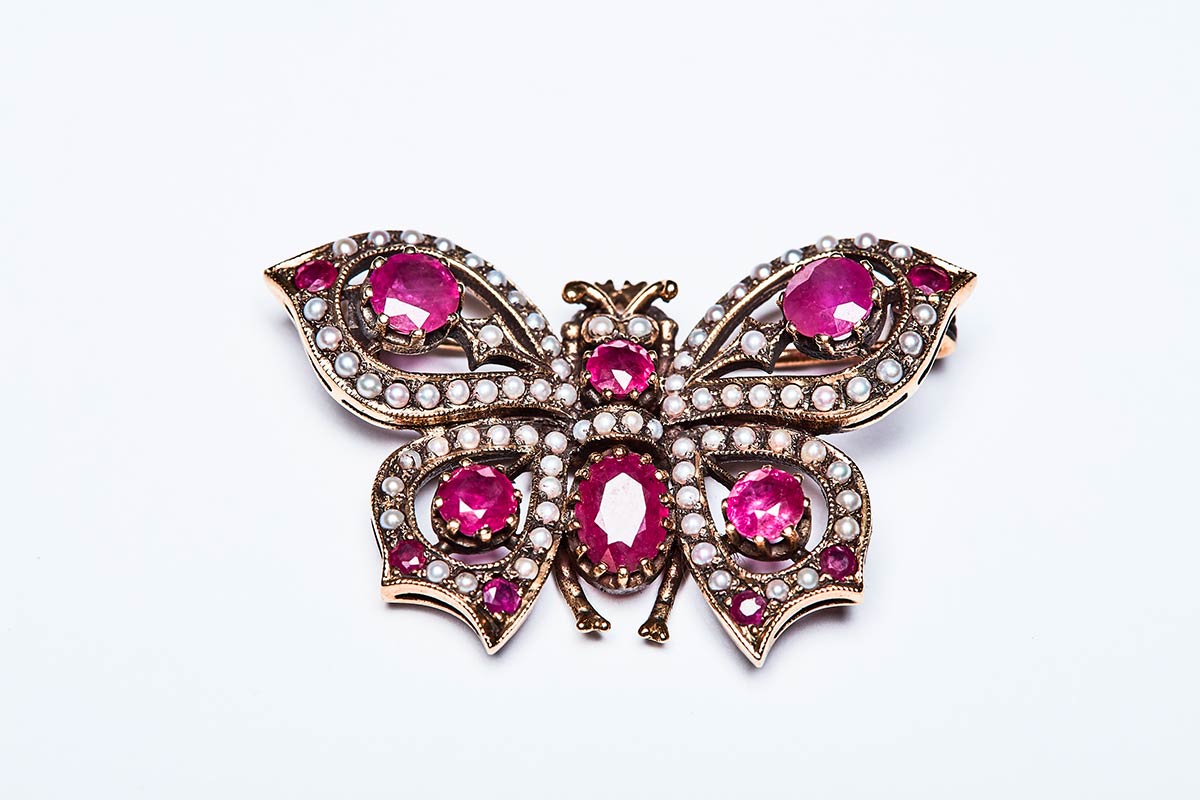 Spilla artigianale realizzata in Italia negli '40 in oro giallo K 9 impreziosita da rubini di ct.6 e piccole perle di 2 ct. Misure 25,6x39,3 mm; peso 7,42 gr.