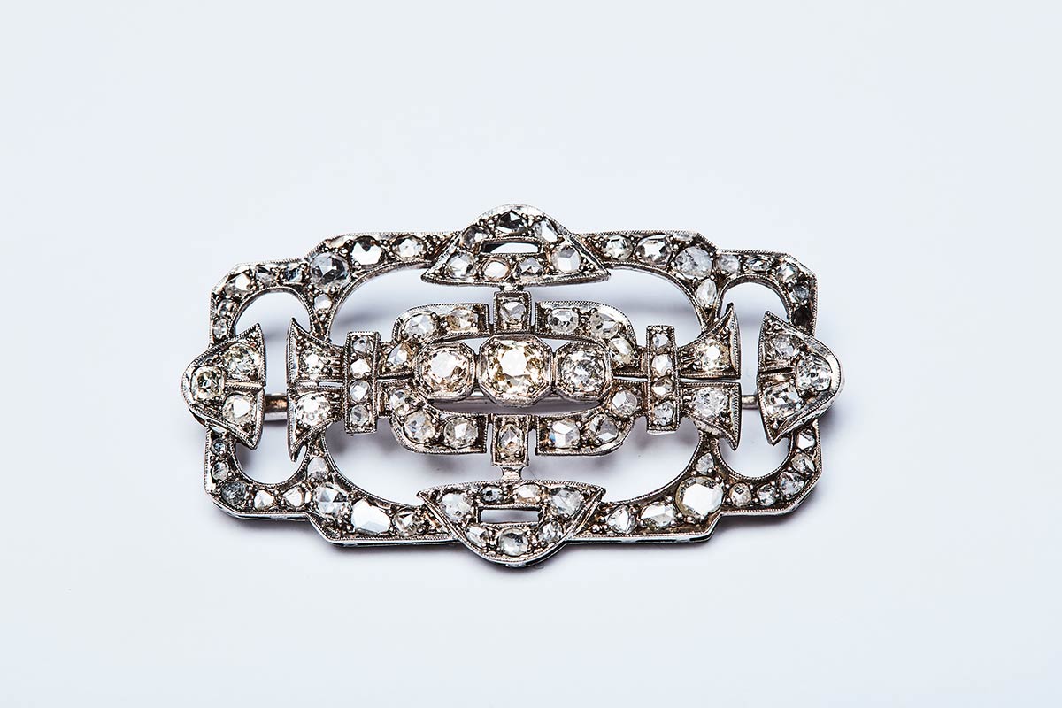 Spilla artigianale realizzata in Italia nel primi anni del '900 in oro bianco K 14 con diamanti taglio rosa coronè di ct.4. Misure 51x30 mm, peso 8,9 gr.