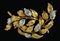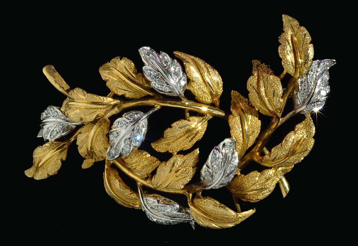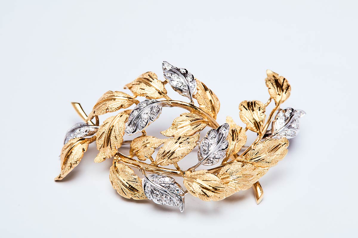 Spilla artigianale realizzata in Italia negli anni '30 in oro giallo e bianco K 18 raffigurante ramoscelli di alloro, simbolo della vittoria e del coraggio, con brillanti ct. 1. Misure 66x41 mm, peso 26,9 gr.