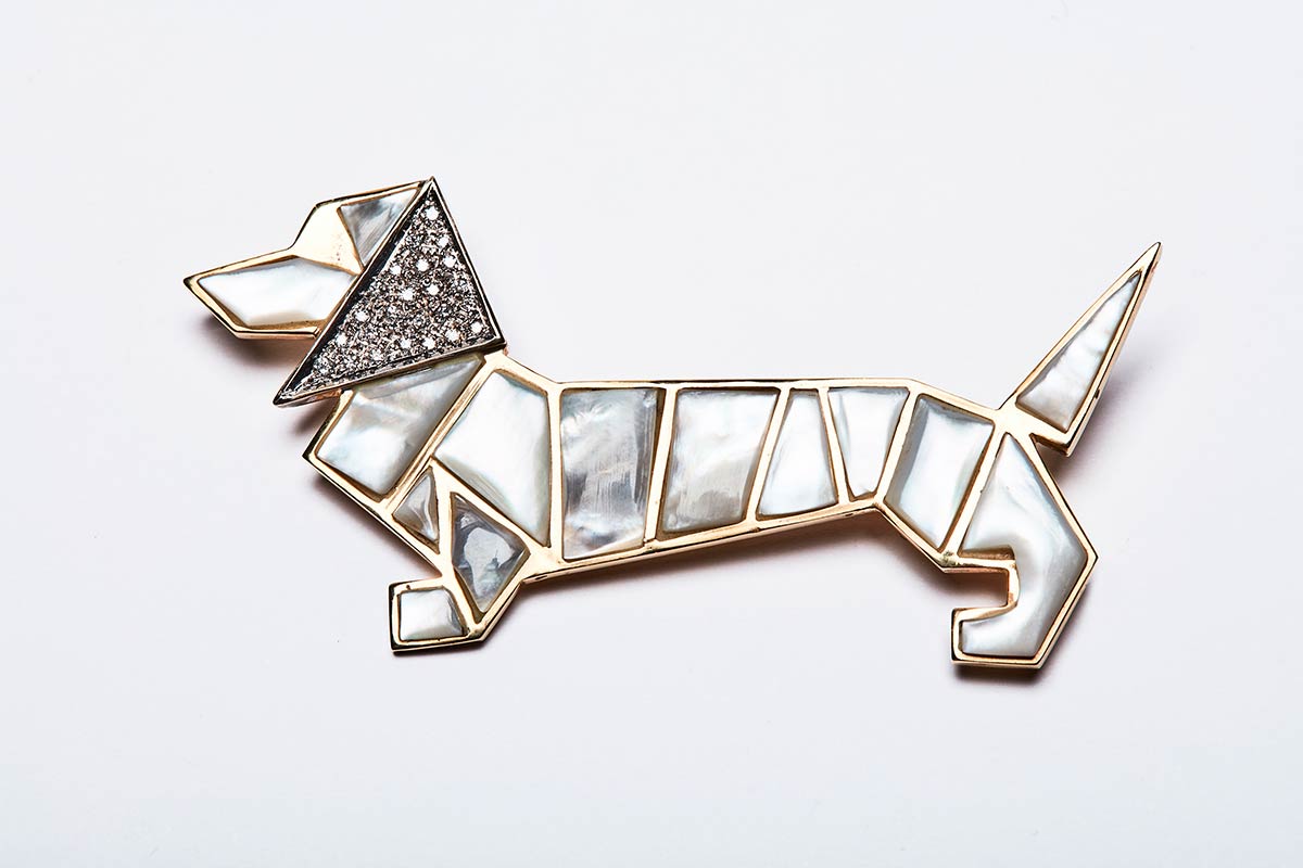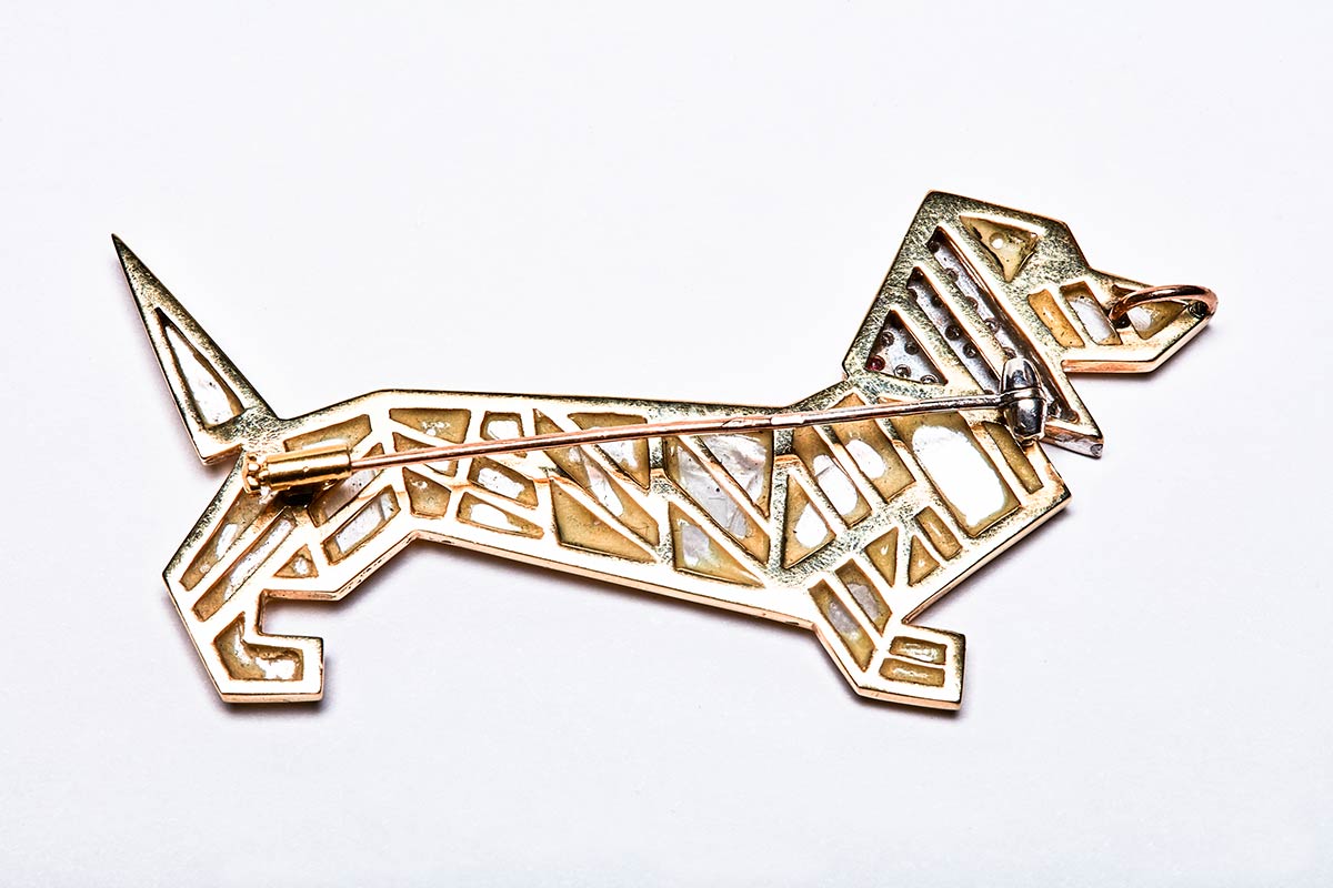 Spilla-pendente artigianale realizzata in Italia negli anni '70 in oro giallo K 14 raffigurante un bassotto dalle orecchie di brillanti di 0,30 ct., e, corpo in madreperla di gr.2. Misura 70x35,7 mm, peso 16,7 gr.