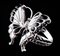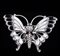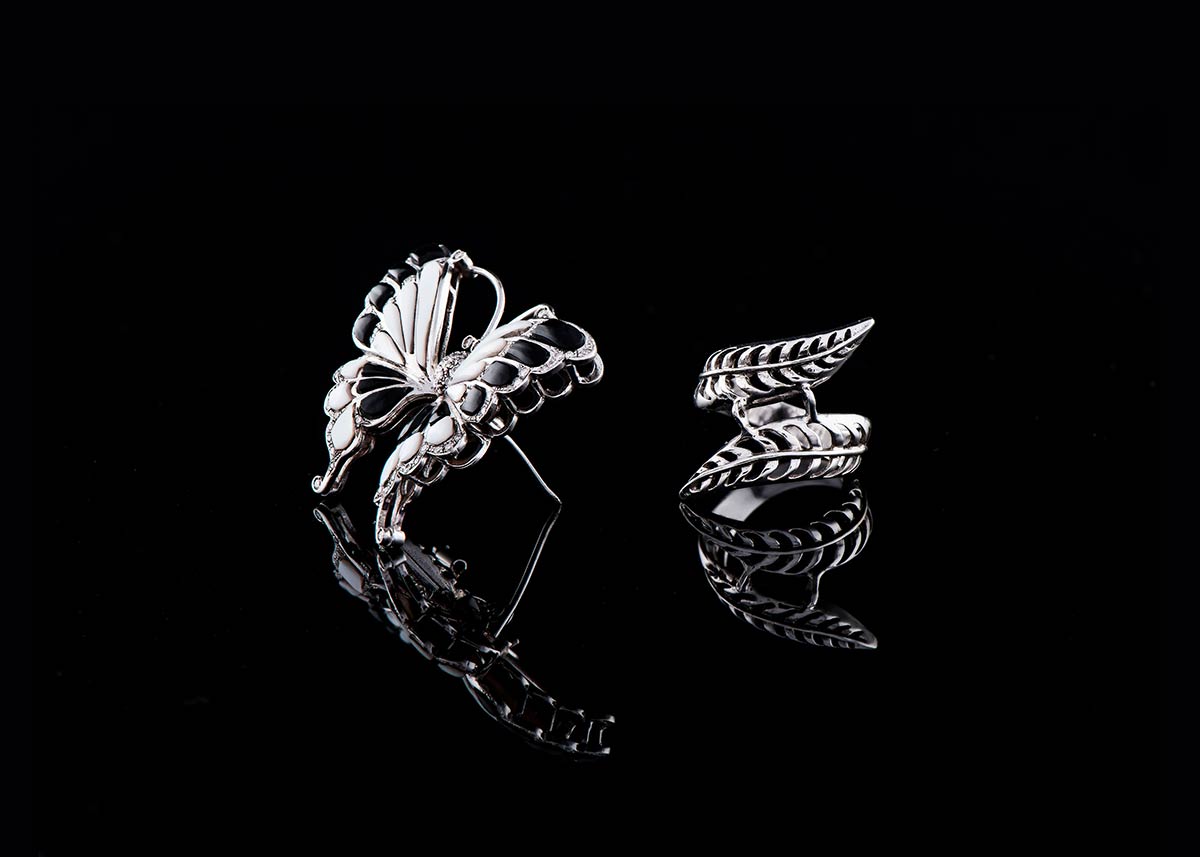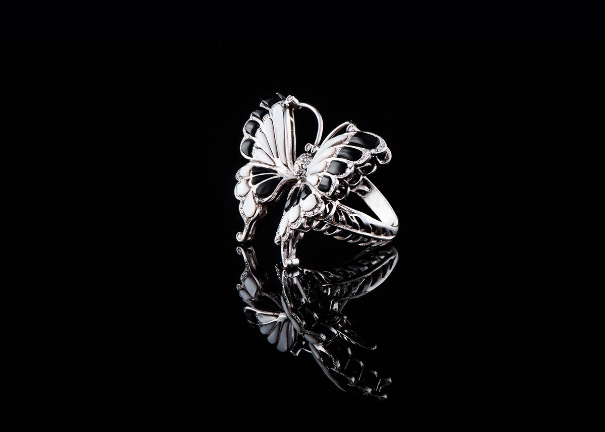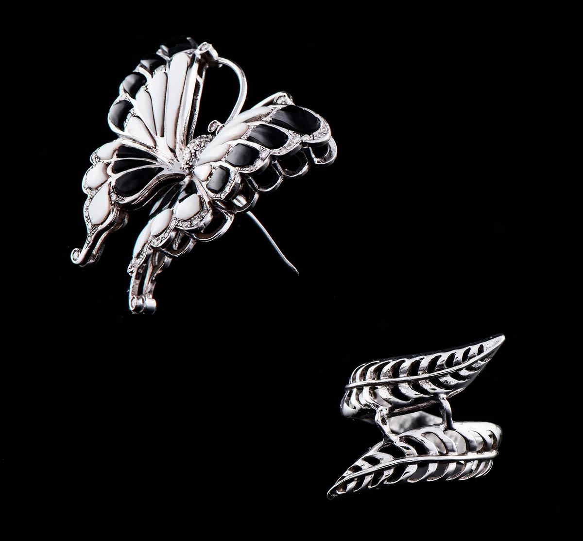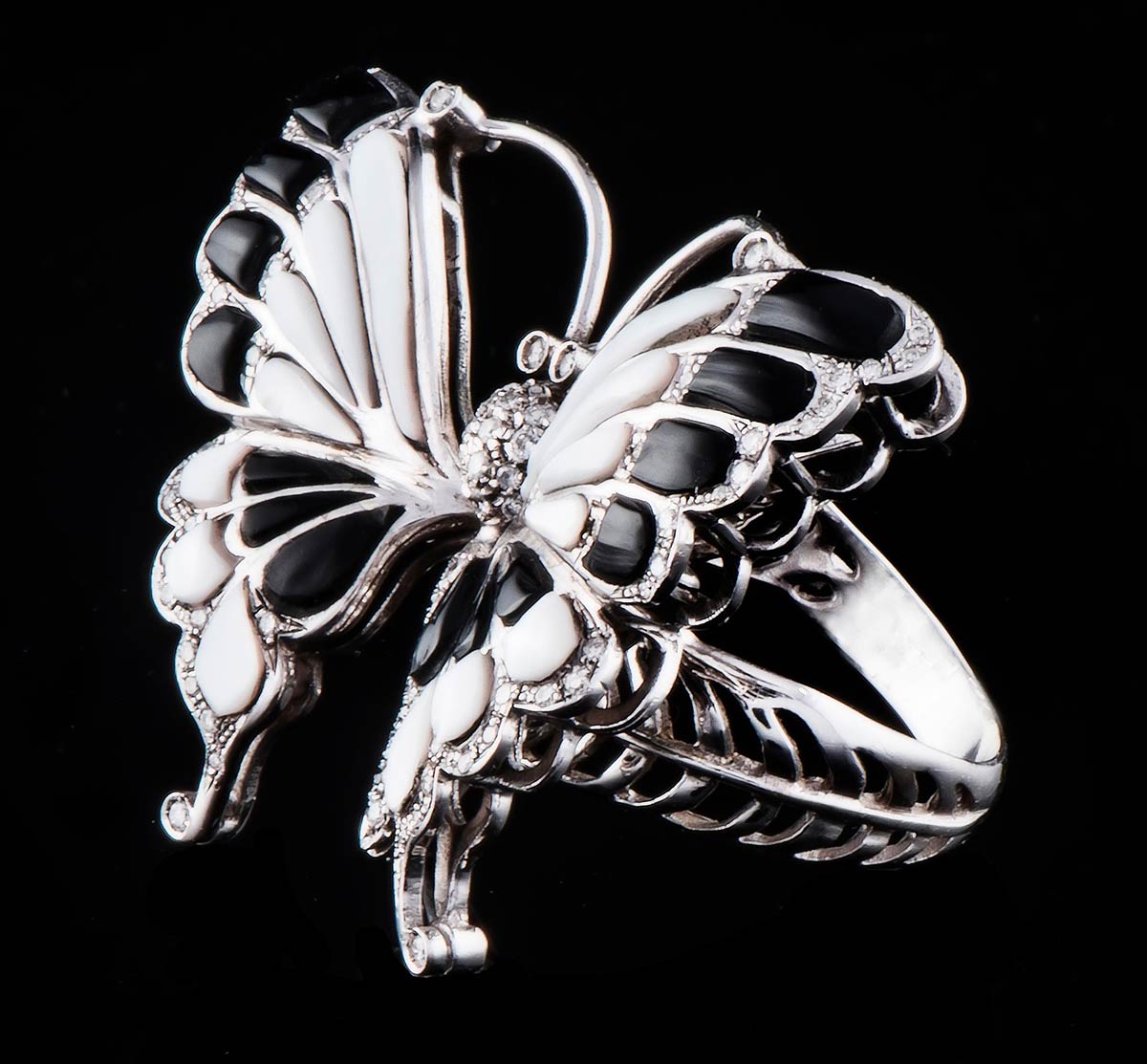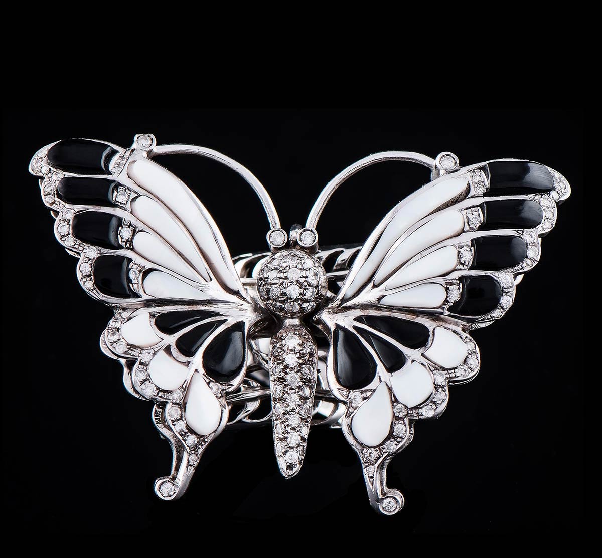 Spilla-anello artigianale realizzato in Italia nel periodo Liberty in oro bianco K 18 con diamanti di 2 ct., madre perla e onice. Il gioiello raffigura una farfalla in procinto di volare, indossabile sia come spilla che come anello. Misura spilla: 49,6x34 mm; misura anello ITA: 20 (18,8 mm); peso 19,34 gr.