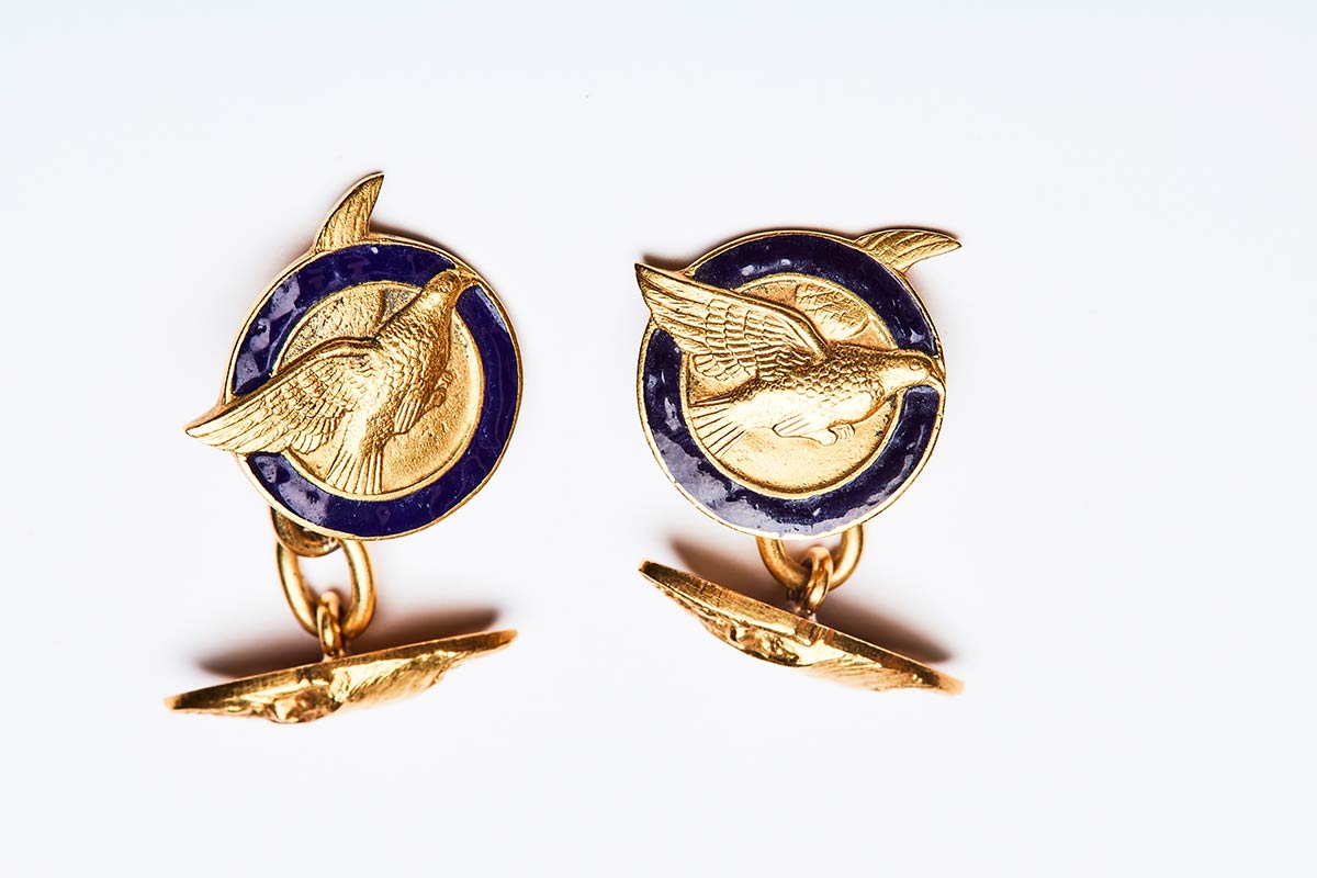 Gemelli artigianali realizzati in italia nei primi anni del '900 in oro giallo K 18 e smalto blu. Al centro di ognuno la raffigurazione di un germano reale in volo. Misura 16 mm, peso 11,60 gr.