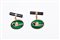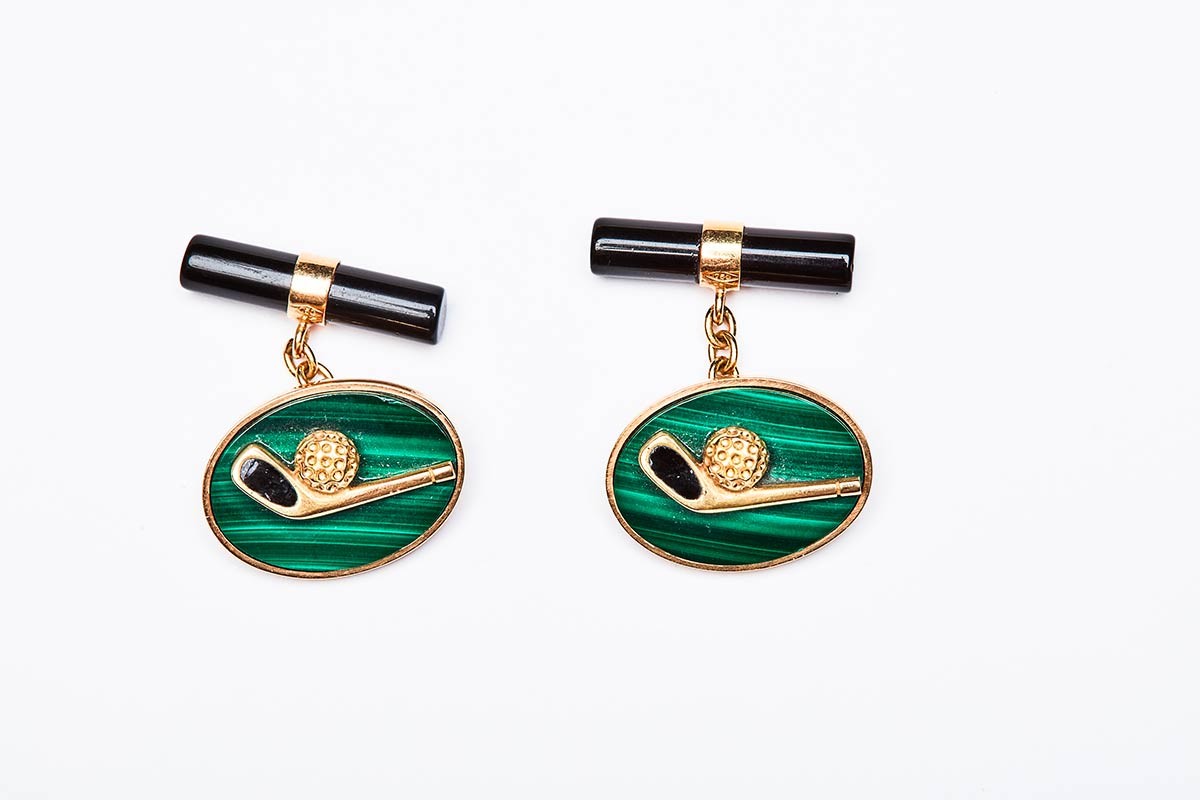 Gemelli artigianali realizzati in italia negli anni 2000 in oro giallo K 18, malachite e onice. Ciascuno raffigurante mazza da golf con pallina. Misura 19,2x14,2 mm, peso 10,8 gr.