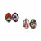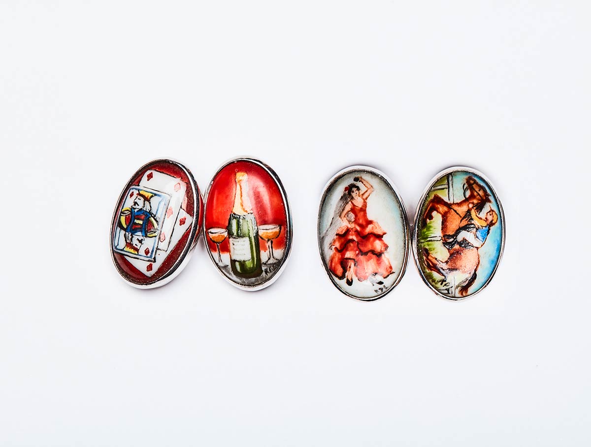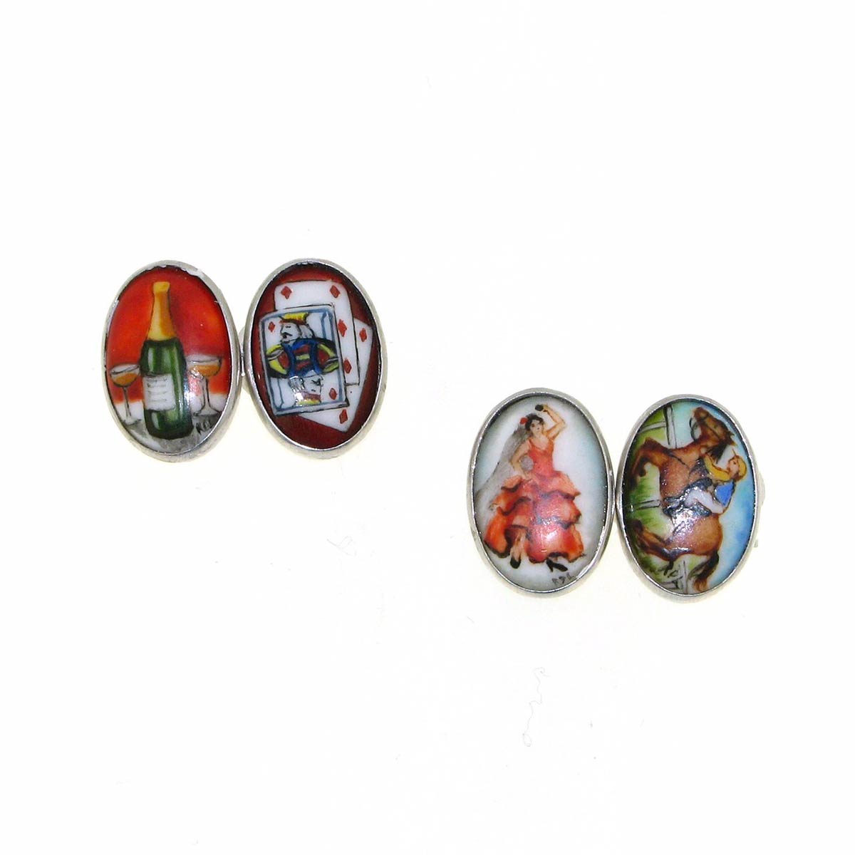Gemelli artigianali realizzati in italia negli anni '60 in oro giallo K 14, raffiguranti i quattro vizi dell’uomo dipinti a mano su porcellana di Capo di Monte. Misure 15,8x11 mm, peso 6,85 gr.