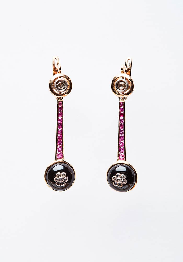 Coppia di orecchini pendenti artigianali realizzati in Italia negli anni '40 in oro giallo K 14 con diamanti taglio antico di 0,23 ct, e rubini taglio carrè a scalare di 1,30 ct. Pendente in onice (0,80 gr) con fiore centrale. Misure 40,5x11 mm, peso 7,68 gr.