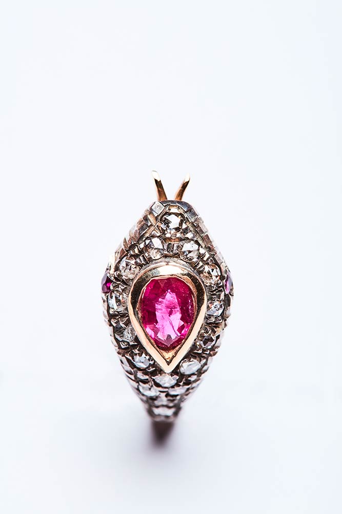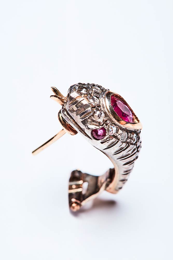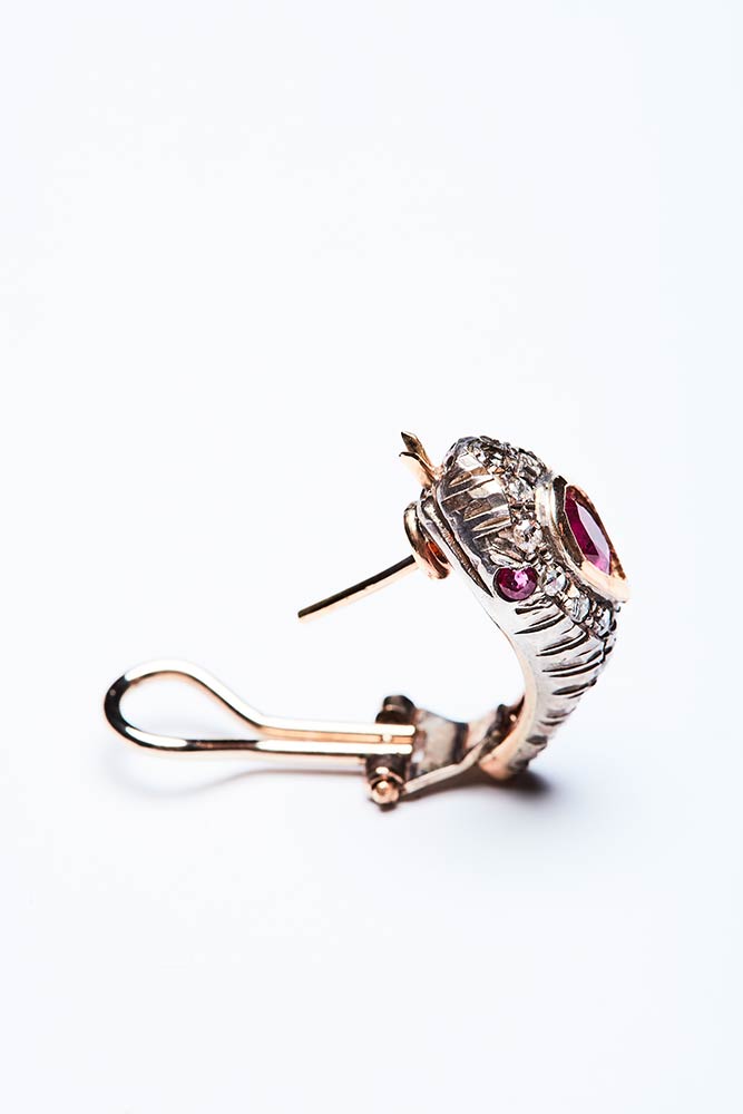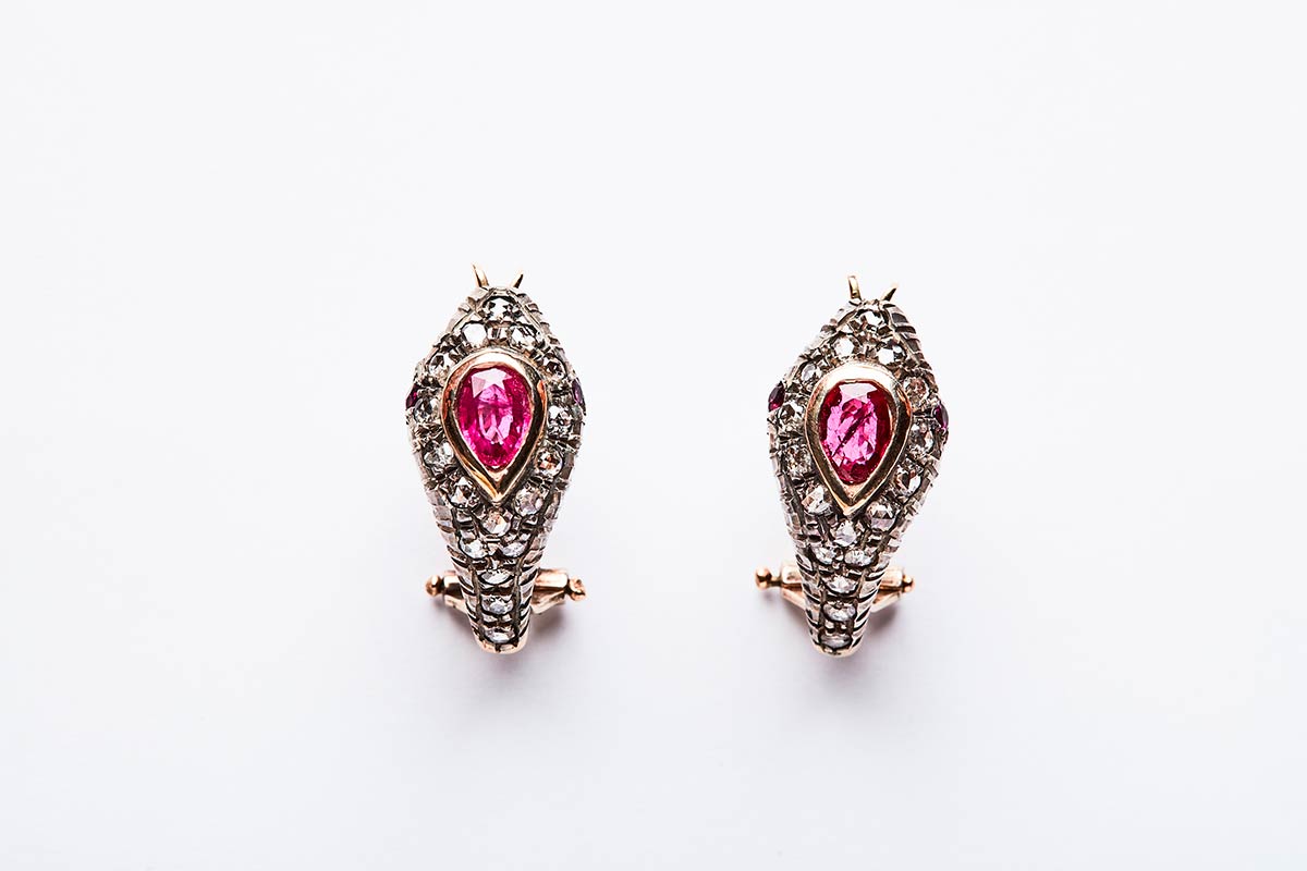 Coppia di orecchini artigianali realizzati in Italia negli anni '40 in oro giallo K 14 e sottile lamina in argento a ricoprire i castoni dei diamanti. A forma di testa di serpenti con occhi di rubini, gli orecchini sono tempestati da diamanti taglio rosetta di 0,90 ct, e rubini centrali taglio a goccia di ct. 1,60 Misure 22,26x0,71 mm, peso 8.58 gr.