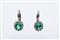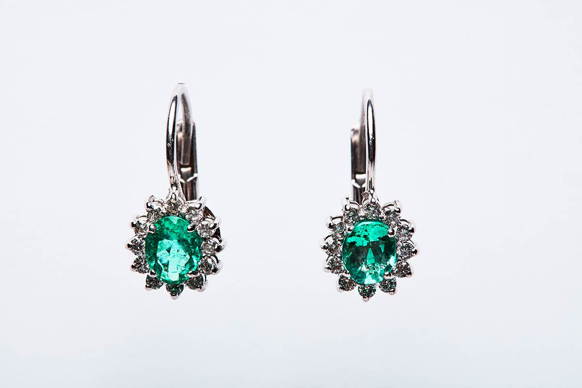 Coppia di orecchini artigianali realizzati in Italia negli anni '50 in oro bianco K 18, entrambi con smeraldo centrale, forma ovale di 0,70 ct contornato da brillanti di 0,24 ct a formare i petali. Misura 8,2mm, peso 2,4 gr.