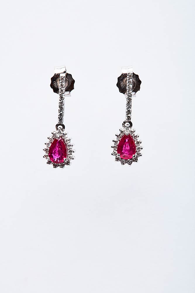 Coppia di orecchini artigianali realizzati in Italia negli anni '50 in oro bianco K 18, con brillanti di 0,42 ct e pendente con rubino centrale a goccia di ct. 0,80. Misure 21x7,1 mm, peso 2,84 gr.