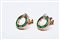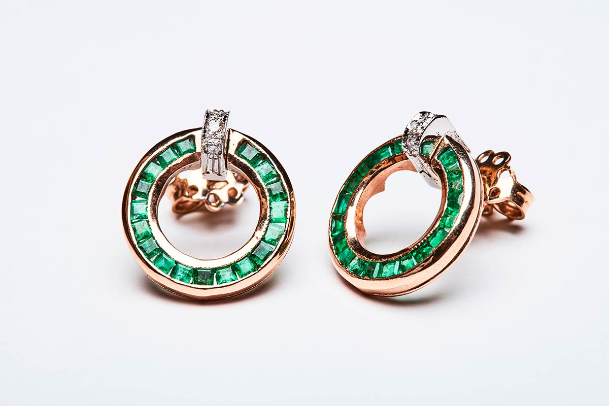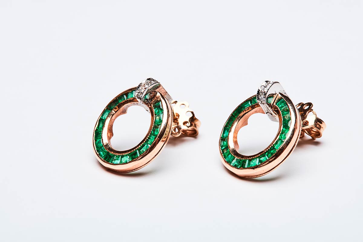 Coppia di orecchini artigianali realizzati in Italia negli anni '40 in oro giallo e bianco K 14 con diamanti di 0,06 ct. e fila circolare di smeraldi taglio carrè di 1,90 ct. Misura 16 mm e peso di 5,72 gr.