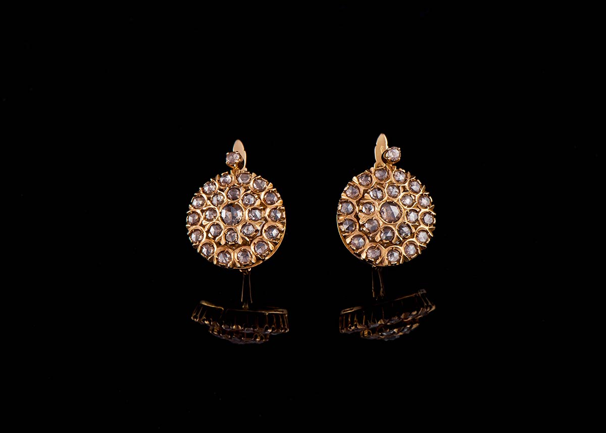 Coppia di orecchini artigianali realizzati in Italia nei primi anni del '900 in oro giallo K 14 tempestati di diamanti taglio rose coronè di 6 ct. Misure 24,80x20,79 mm, peso 12 gr.