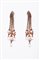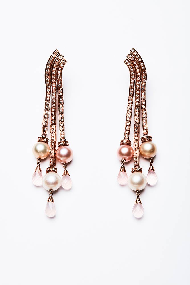 Coppia di orecchini artigianali realizzati in Italia negli anni '60 in oro giallo K 14, impreziositi da 3 linee di brillanti di 2,5 ct. Ciascuna con finale a perla rosa, bianca e gold di 10 mm ognuna. e quarzi rosa taglio briolet di 6 ct. Lunghezza 93 mm e peso 29 gr.