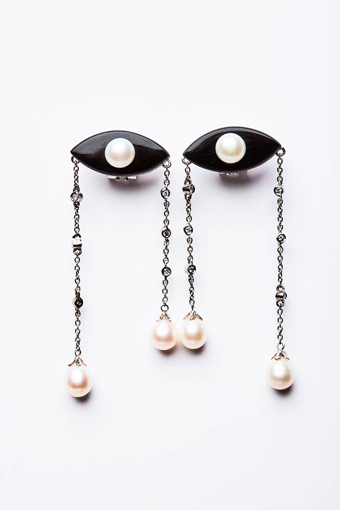 Coppia di orecchini artigianali realizzati in Italia negli anni '50 in oro bianco K 14. Entrambi in onice (2 gr.) e perle (8 mm ciascuna). a formare un occhio dalle cui estremità scendono due catenine impreziosite da brillanti di 0,25 ct. E perle pendenti di 8 mm . Misure 73,5x27,6 mm, peso 18,52 gr