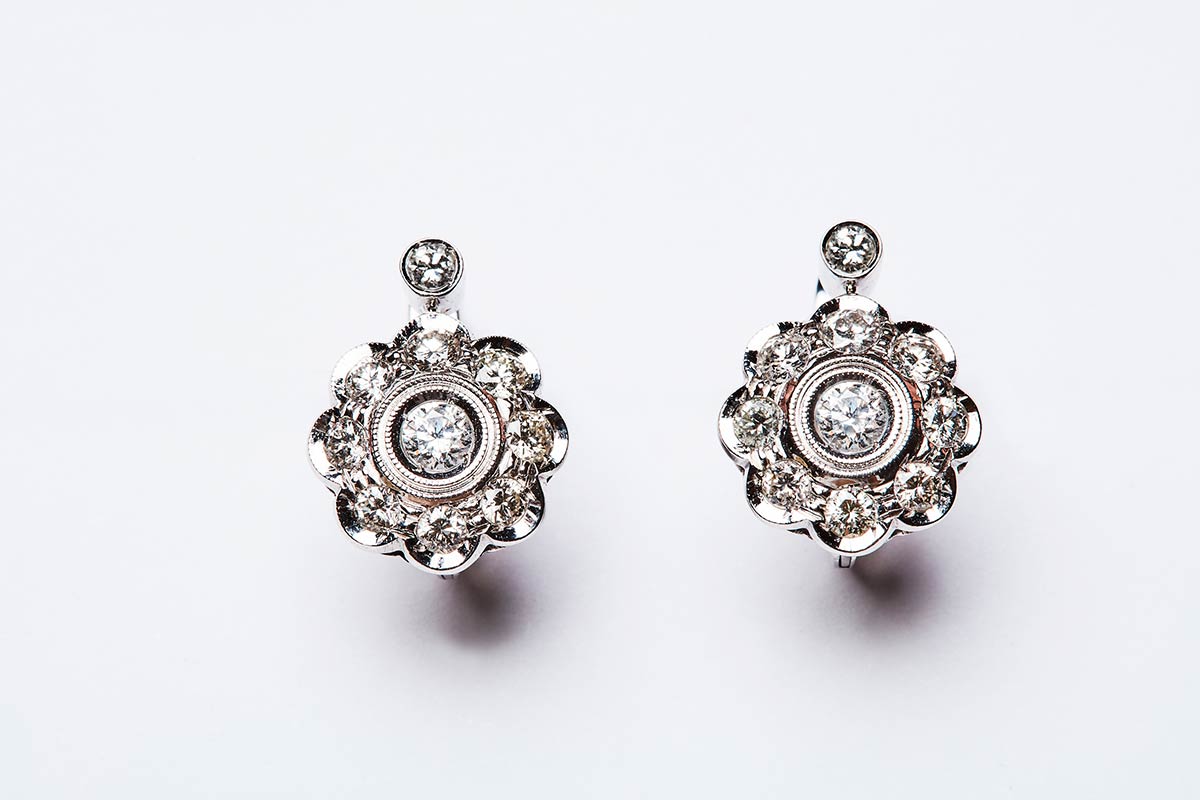 Coppia di orecchini artigianali realizzati in Italia negli anni '30 in oro bianco K 18 e brillanti di 1,50 ct. Misure 17 mm, peso 5,33 gr.