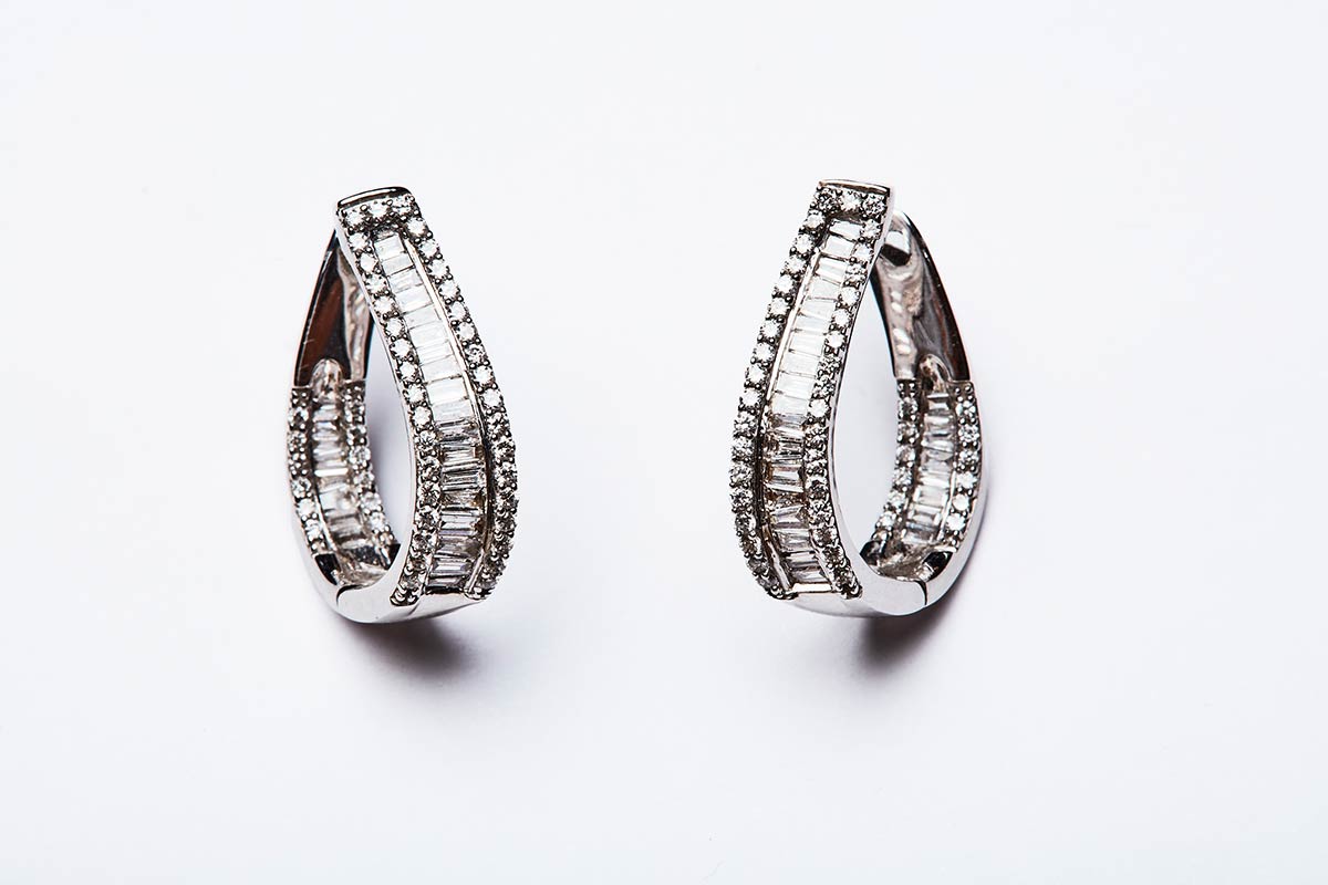 Coppia di orecchini realizzati in Italia negli anni 2000 in oro bianco K 18. Impreziositi sia esternamente che intermanete da brillanti e diamanti taglio baguette per un totale di 1,00 ct. Lunghezza 20,8 mm, peso 6,92 gr.