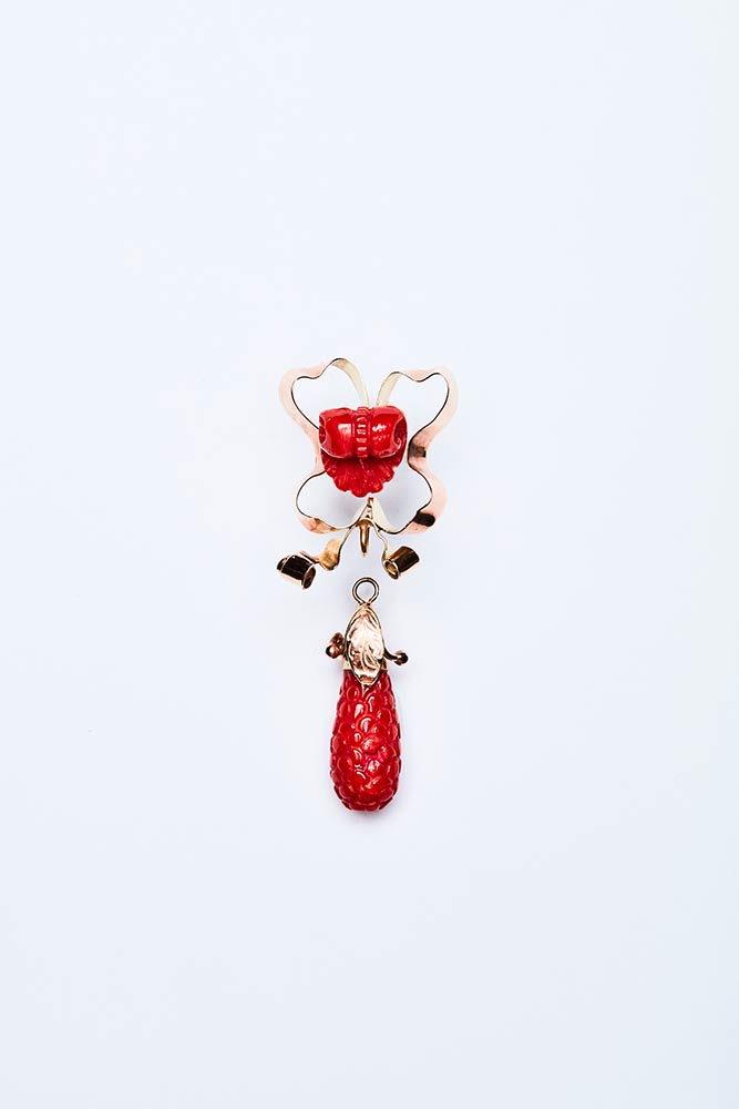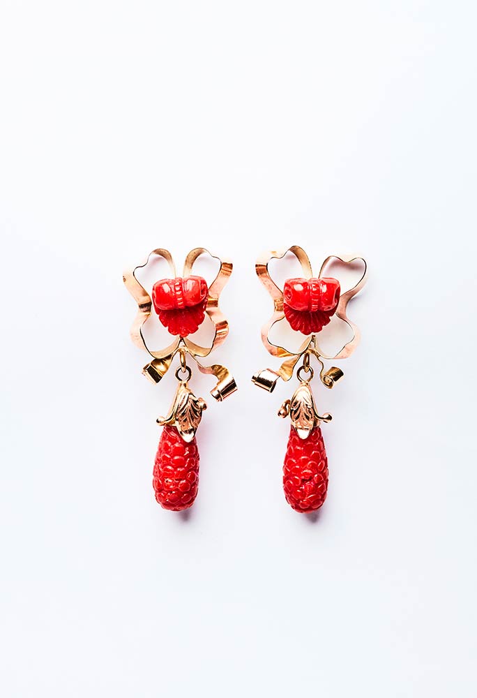 Coppia di orecchini artigianali realizzati in Italia nei primi anni del '900 in oro giallo K 18. Il corpo superiore a forma di festone centrato da una foglia arrotolata in corallo mediterraneo (Corallium Rubrum), il pendente, anch'esso in corallo, rappresenta una pigna simbolo di forza e immortalità. La parte inferiore è sganciabile. Misure 50x28,88 mm, peso 12,33 gr. Il lotto è accompagnato da certificato Ce.Sa.R. Questo lotto contiene avorio/corallo/tartaruga o altre specie protette dalla regolamentazione CITES (the Convention on International Trade in Endangered Species of Wild Fauna and Flora).