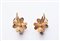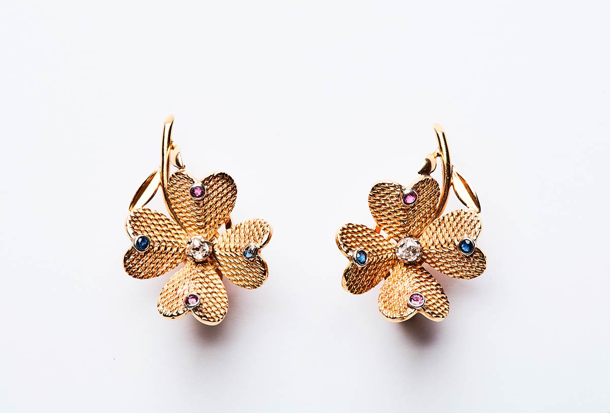 Coppia di orecchini artigianali realizzati in Italia negli anni '30 in oro giallo K 18. Entrambi con diamante centrale taglio vecchio di 0,20, ogni foglia impreziosita da rubini e zaffiri di 0,20 ct. totale. Misure 34,94x23,49 mm , peso 13,83 gr.