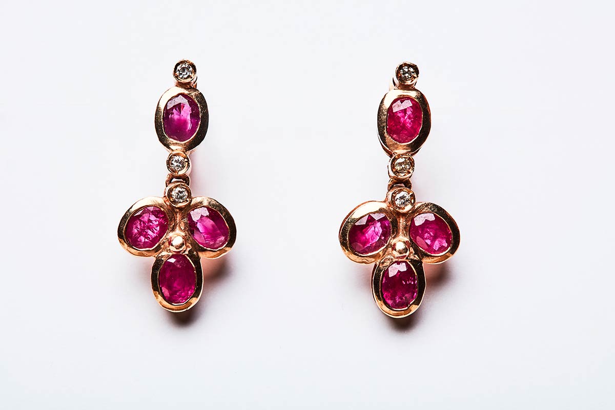 Coppia di orecchini artigianali realizzati in Italia negli anni '40 in oro giallo K 14, diamanti di 0,10 ct e rubini di forma ovale di 6 ct. Misure 25,4x12,3 mm, peso 7,8 gr.