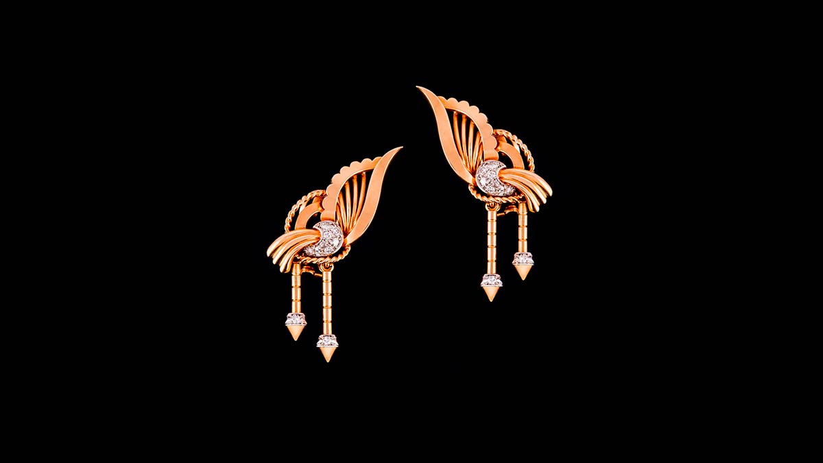 Coppia di orecchini artigianali realizzati in Italia nel periodo decò, a forma di gru stilizzati, in oro giallo K 18 e brillanti di 0,60 ct. Misure 50,22x15,06 mm, peso 16,2 gr.