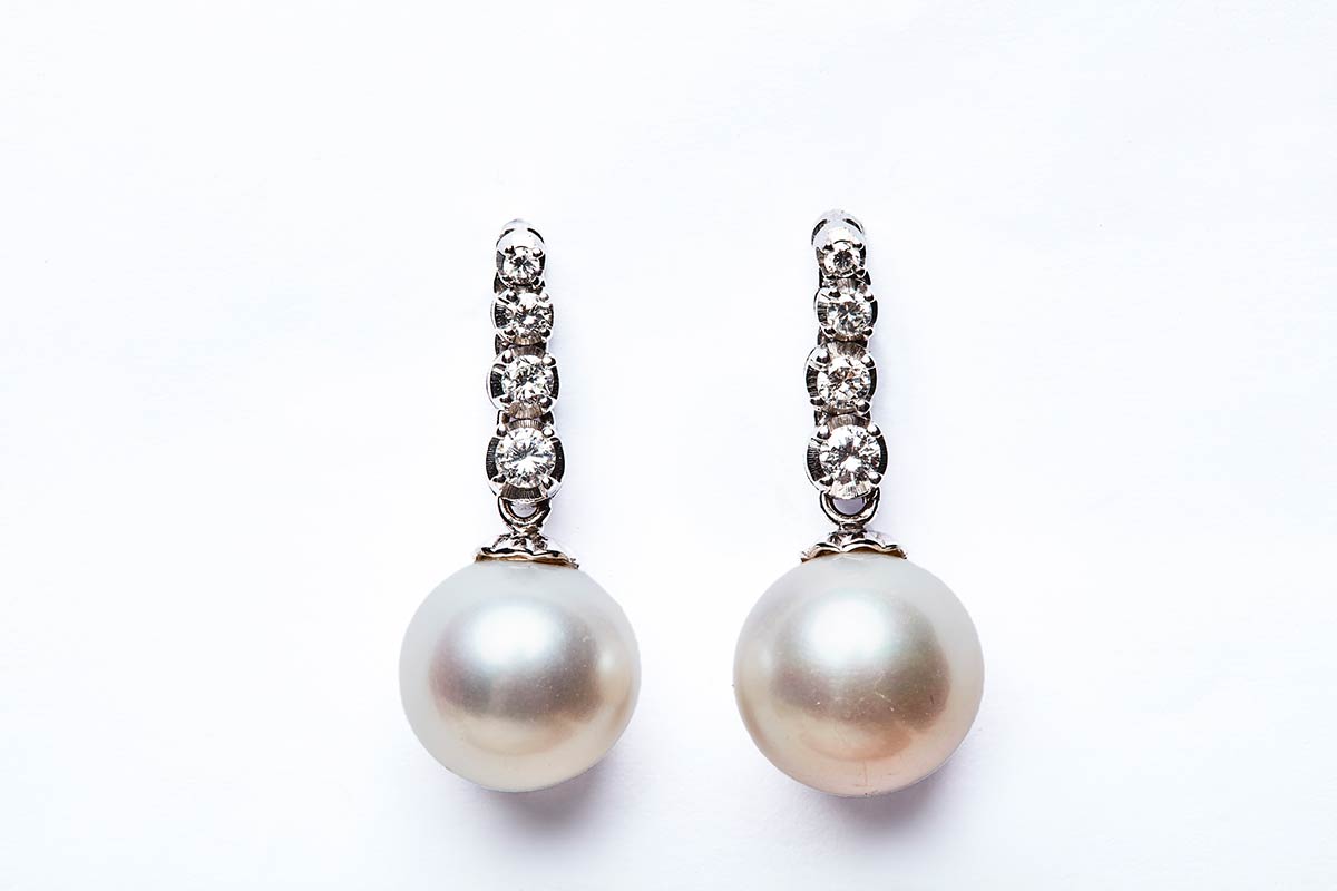 Coppia di orecchini artigianali realizzati in Italia negli anni '60 in oro bianco K 18, brillanti di 0,50 ct e perle da 12 mm ciascuna. Misure 27,54x11,23 mm, peso 7,80 gr.