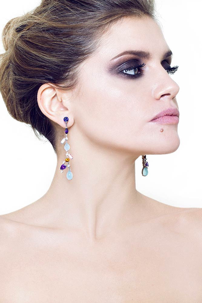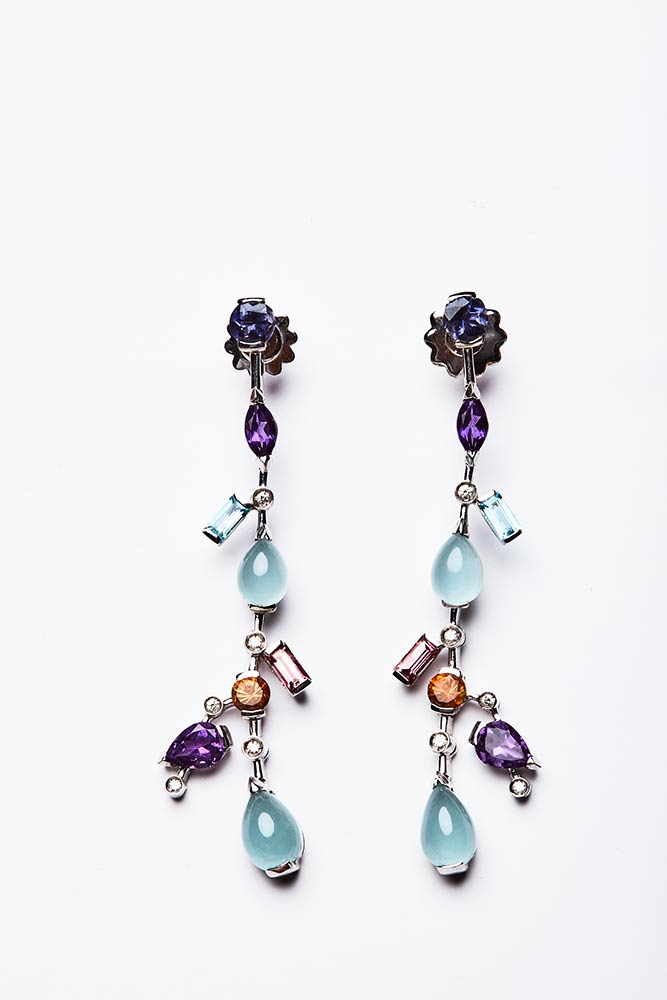 Coppia di orecchini artigianali realizzati in Italia negli anni '80 in oro bianco K 18, impreziositi da varie pietre prezione: brillanti di 0,20 ct, acqua marina 6 ct taglio rettangolare e cabochon milk, ametista 4 ct taglio marquise e a goccia, iolite 0,80 ct. taglio rotondo, e quarzo citrino di 1,50 ct taglio rotondo. Lunghezza 76,5 mm, peso 20,6 gr.