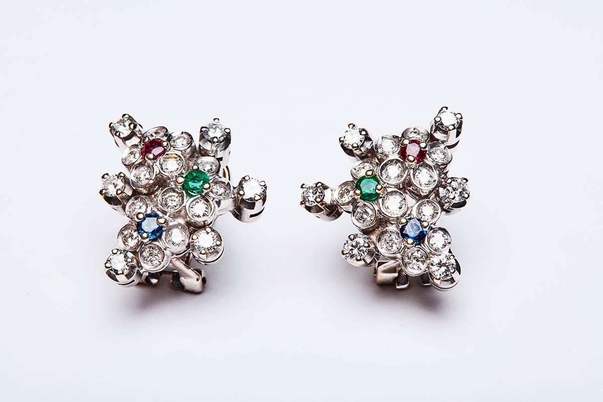 Coppia di orecchini artigianali realizzati in Italia negli anni '70 in oro bianco K 18, brillanti 1,14 ct e smeraldi, rubini e zaffiri di 0,30 ct. Totali. Lunghezza 17,4 mm, peso 10,10 gr.