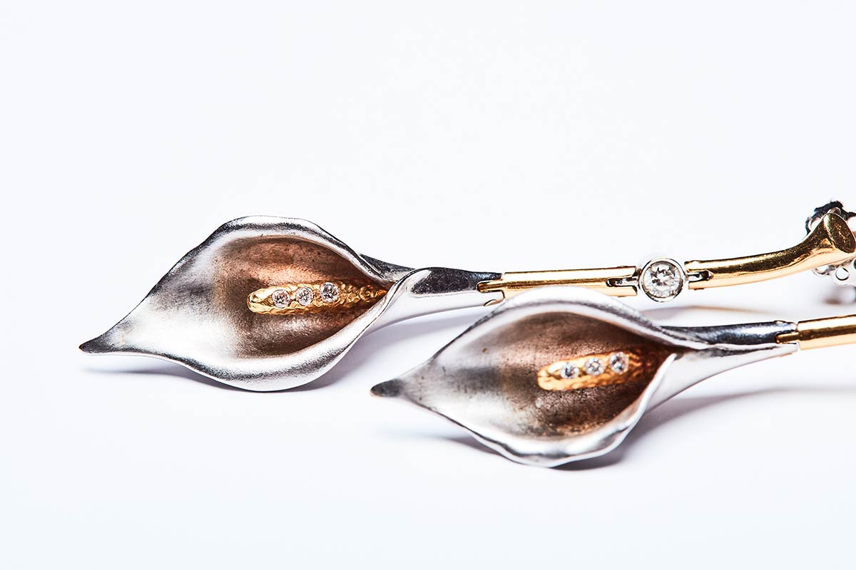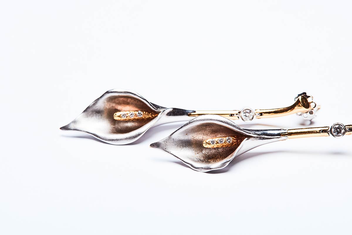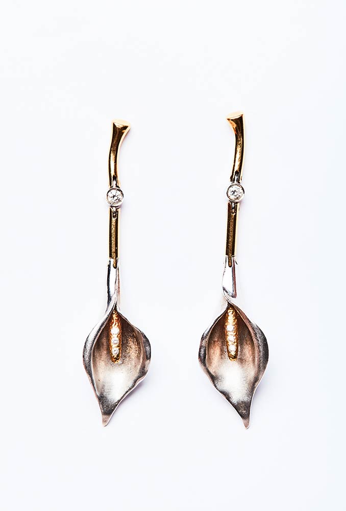 Coppia di orecchini artigianali realizzati in Italia negli anni '80 in oro giallo e bianco K 18 a forma di calle, entrambi con brillanti di 0,50 ct. I gambi delle calle sono snodati per creare un effetto di movimento. Lunghezza 65 mm, peso 17 gr.
