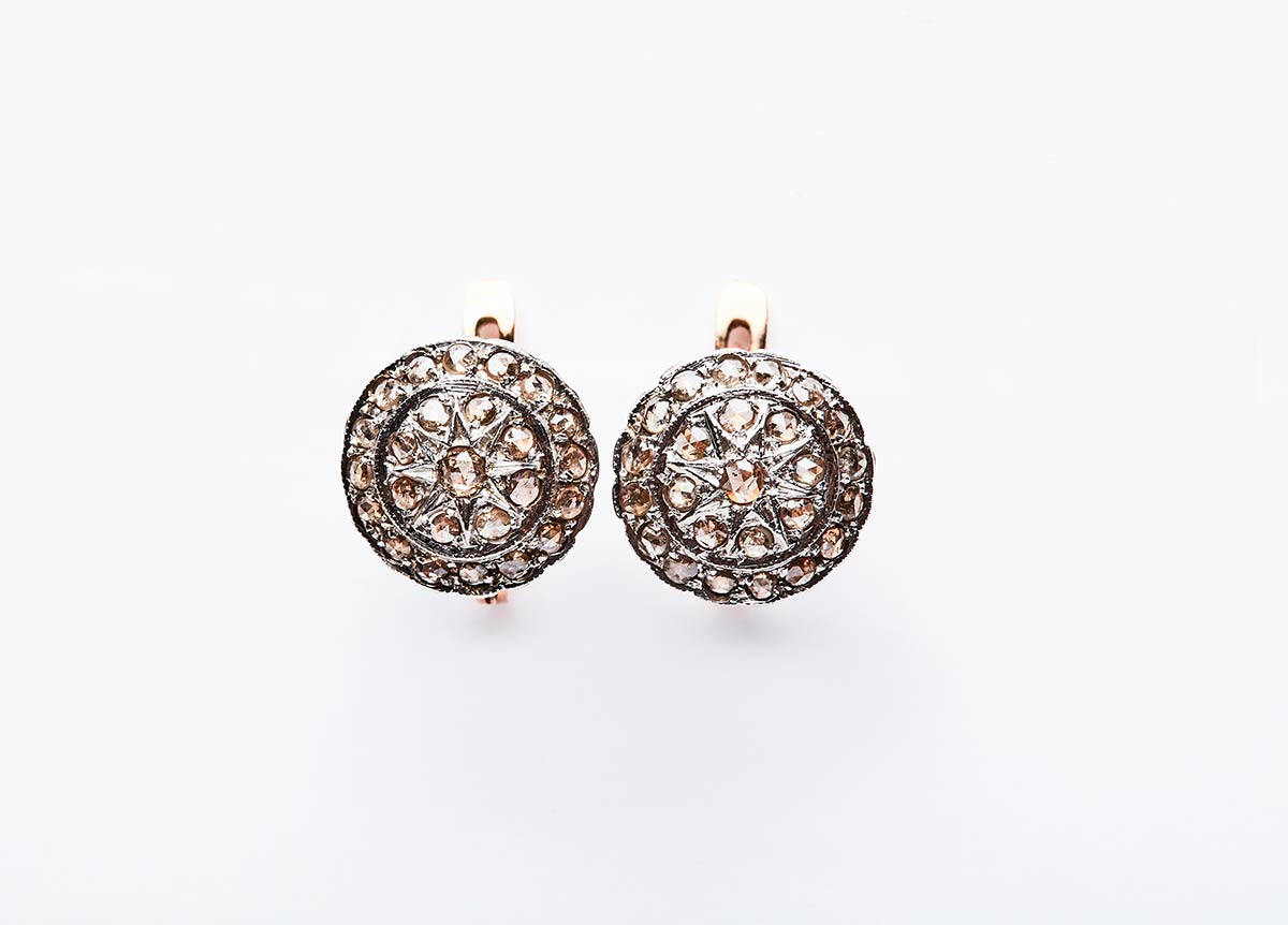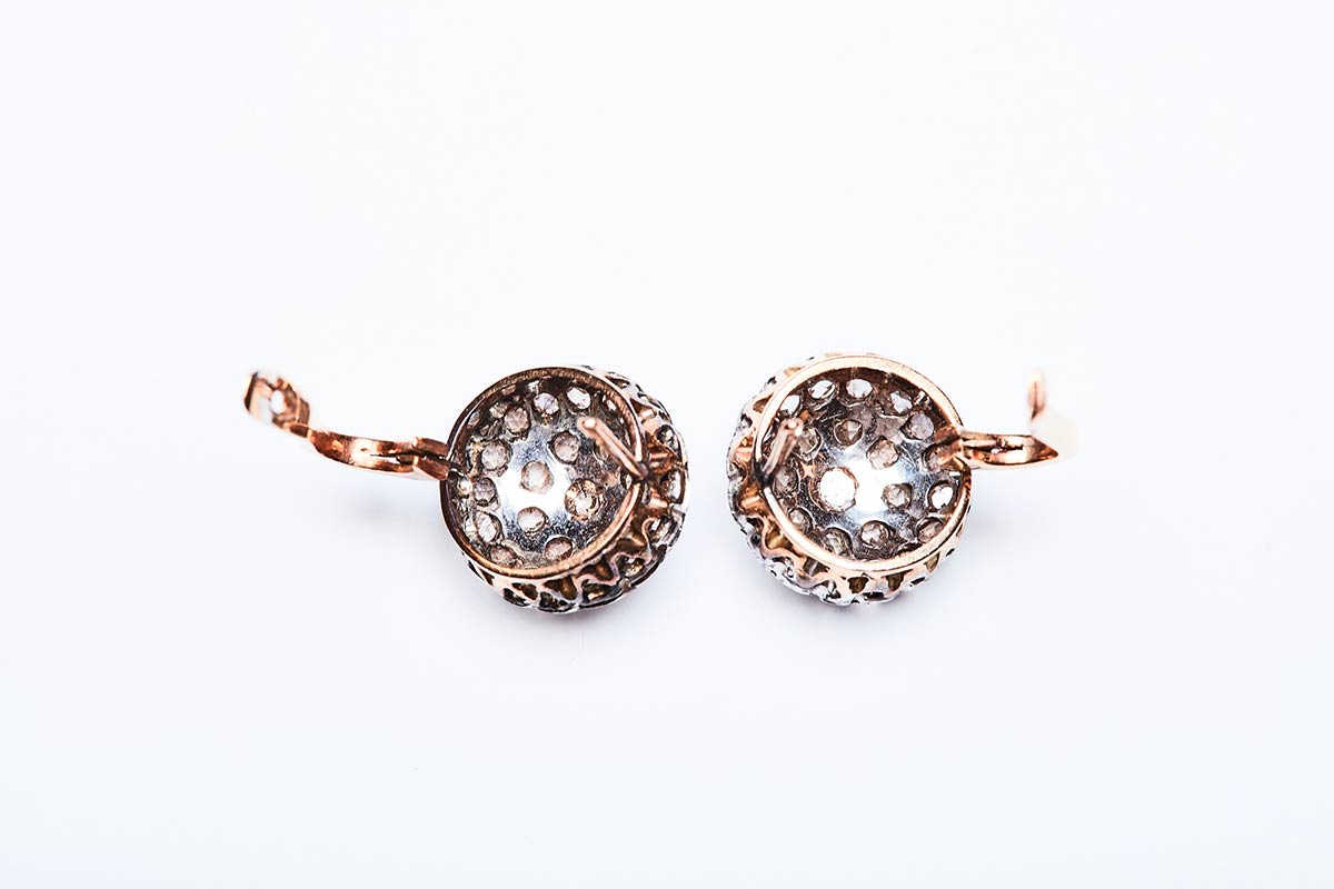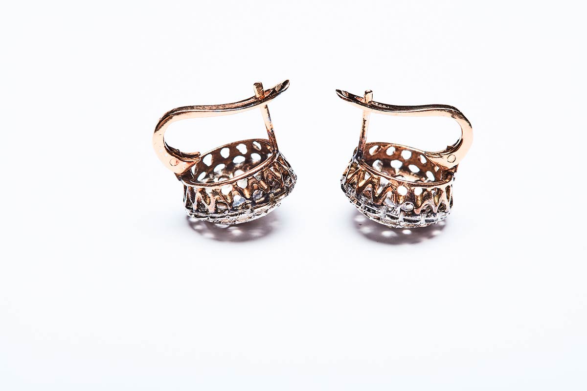 Coppia di orecchini artigianali realizzati in Italia negli anni '20 in oro giallo e bianco K 14. Entrambi impreziositi da diamanti taglio rose coronè di 2,10 ct. Diametro 15,8 mm, peso 8,3 gr.