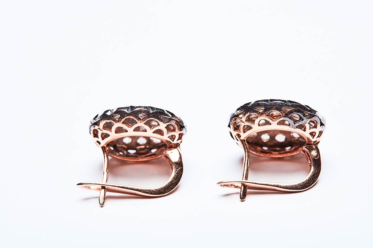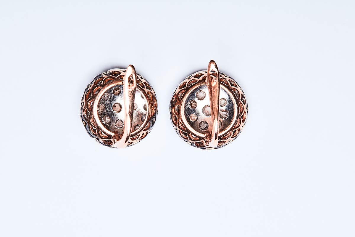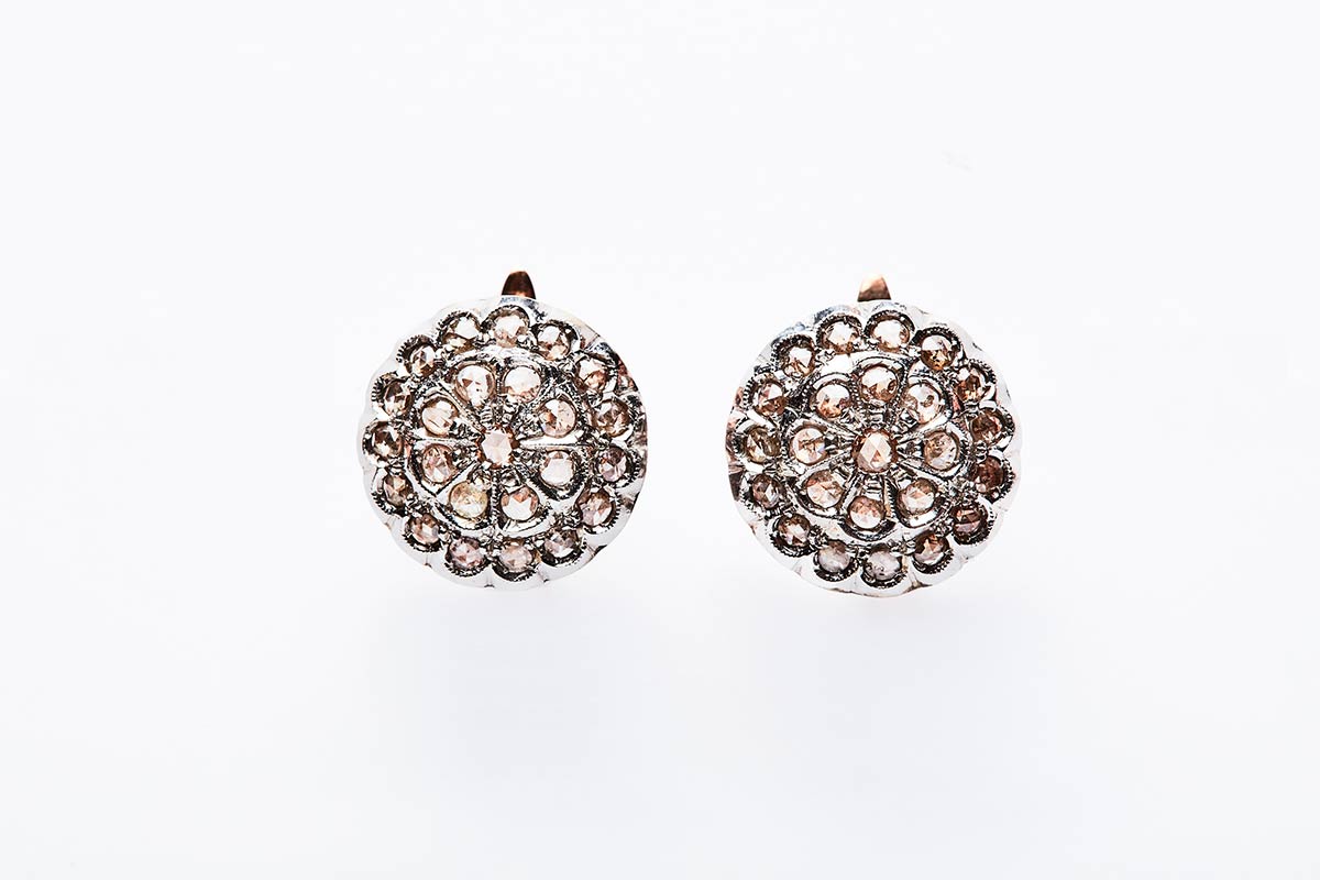 Coppia di orecchini artigianali realizzati in Italia negli anni '20 in oro giallo e bianco K 14. Entrambi impreziositi da diamanti taglio rose coronè di 2,50 ct. Diametro 18 mm, peso 9,5 gr.