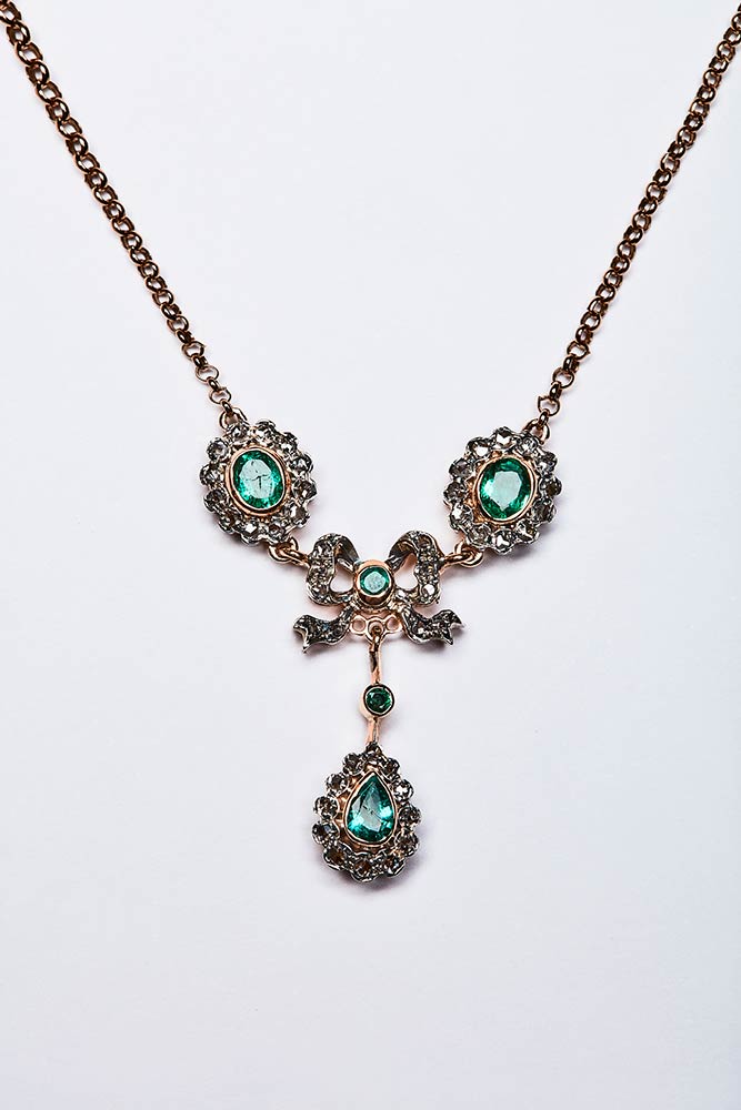 Collier artigianale realizzato in Italia negli anni '40 in oro giallo K 14 e sottile lamina d'argento a copertura dei castoni. Impreziosito da smeraldi di forma ovale, rotonda e a gocchia di 1,20 ct., e diamanti taglio antico di 0,25 ct. Lunghezza 48 cm., peso 8 gr.