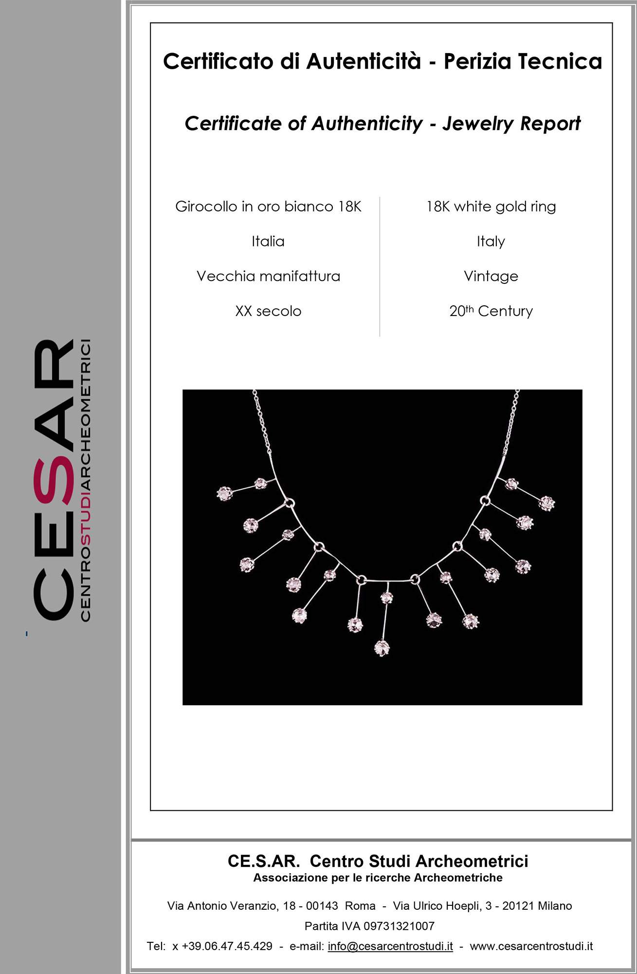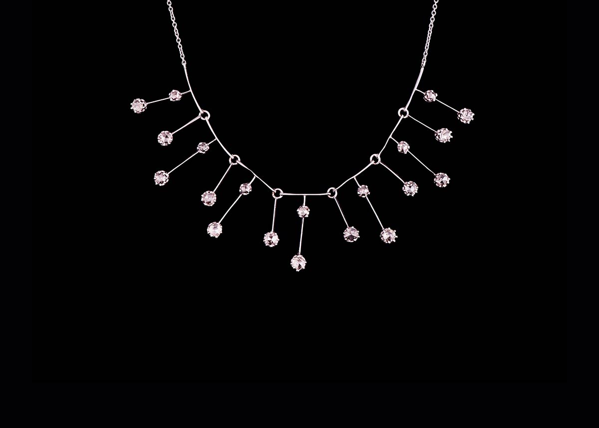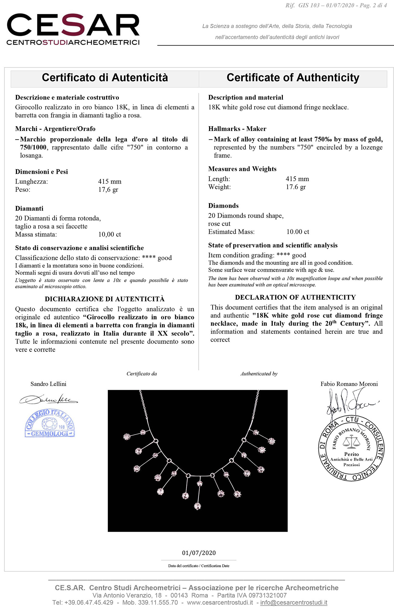Collier artigianale realizzato in Italia nei primi anni del '900 in oro bianco K 18 con diamanti taglio rose coronè di 10 ct. Lunghezza 42 cm, pendenti dai 20 ai 30 mm, peso 17,80 gr.