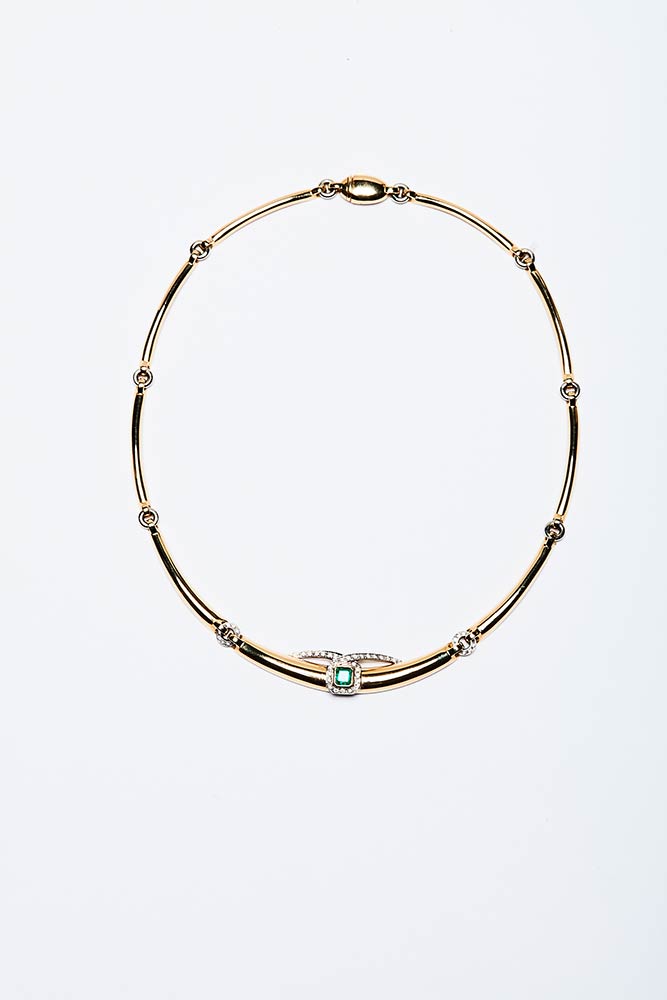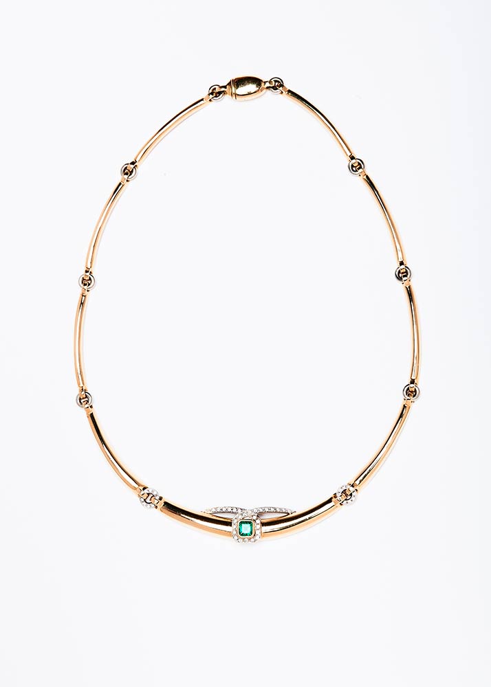 Collier realizzato in Italia negli anni '80 in oro giallo e bianco K 18, smeraldo di 1,50 ct, e diamanti colore G purezza VS di 1 ct. Il gioiello è firmato "DAMIANI". Peso 40.70 gr.