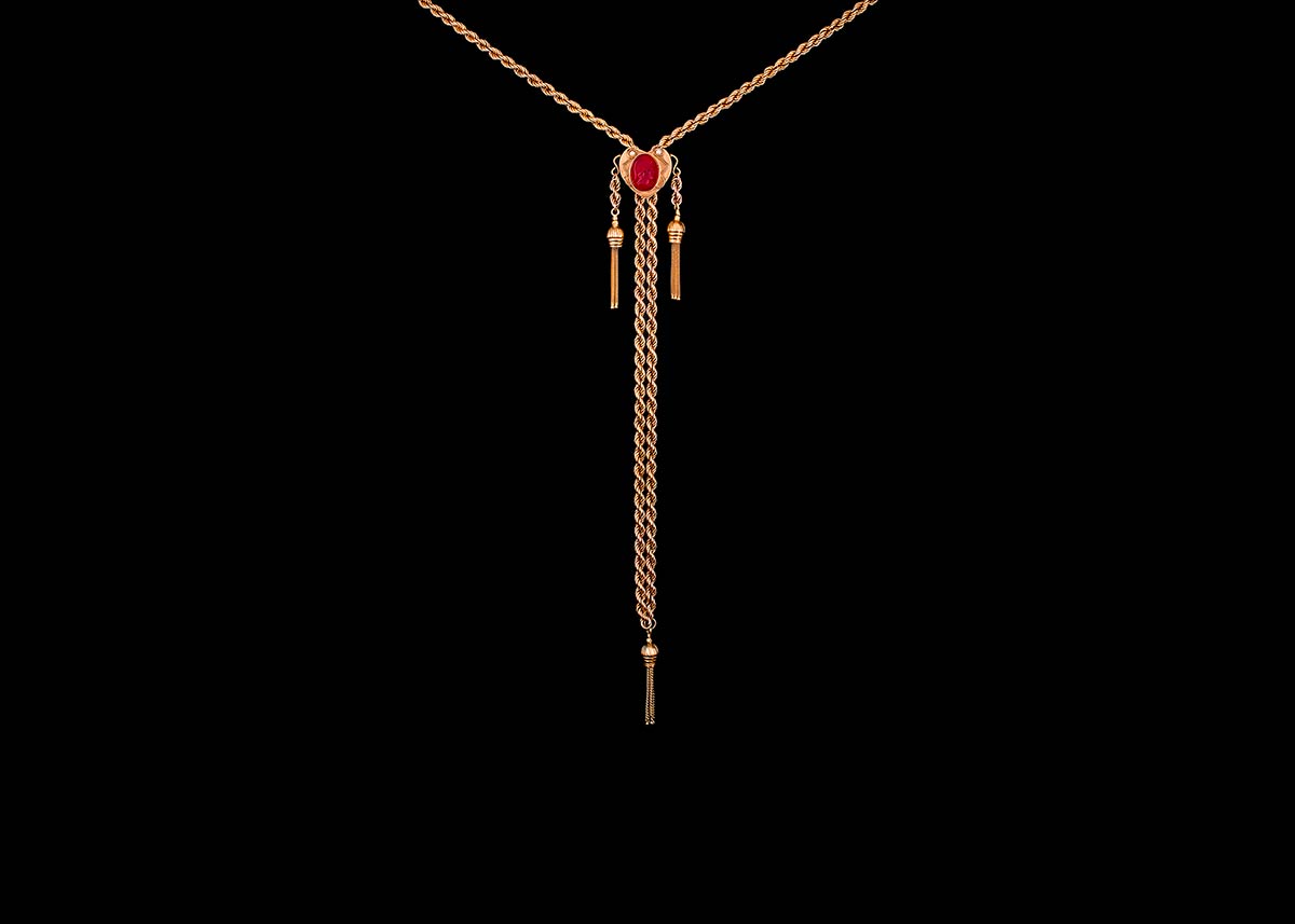 Collier artigianale realizzato in Italia nei primi anni del '900 in oro giallo K 12 a torchon con pendenti a nappine, modello "sali-scendi". Corniola centrale incisa con testa di guerriero, affiancata da due perline. Lunghezza 120 cm, peso 51,40 gr