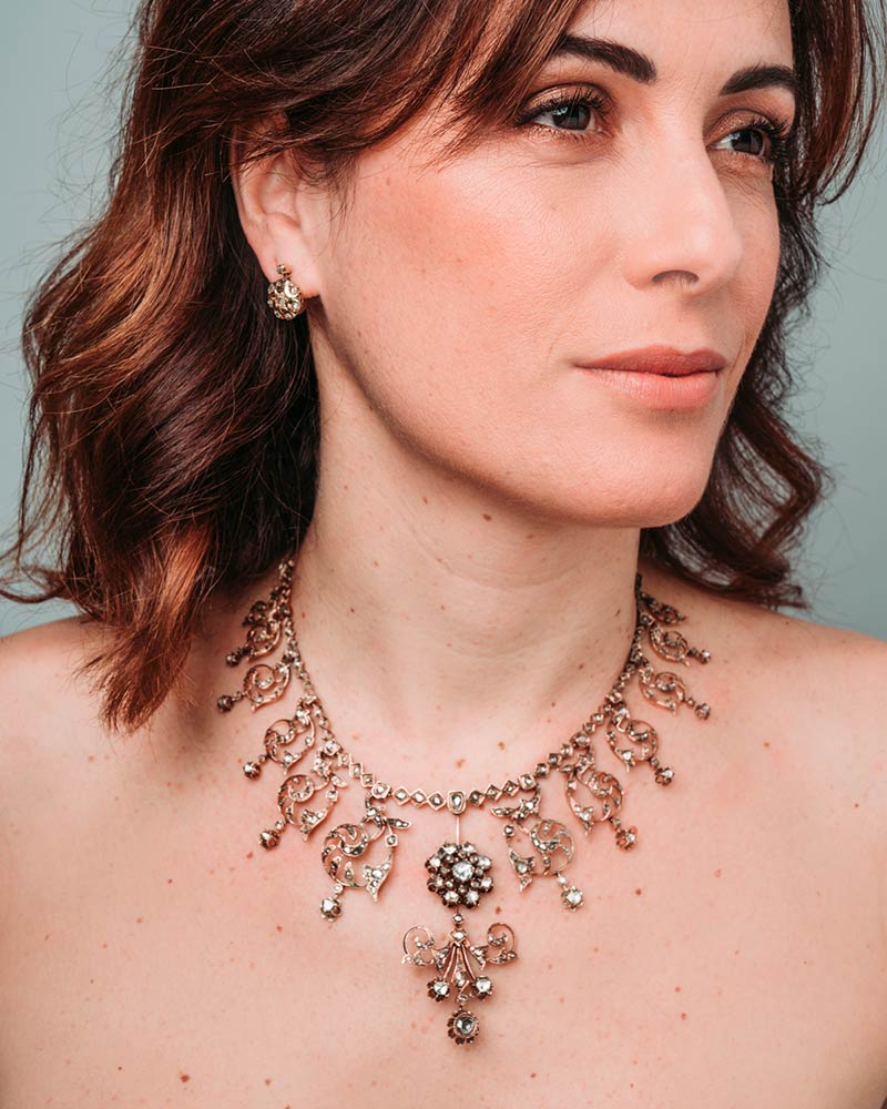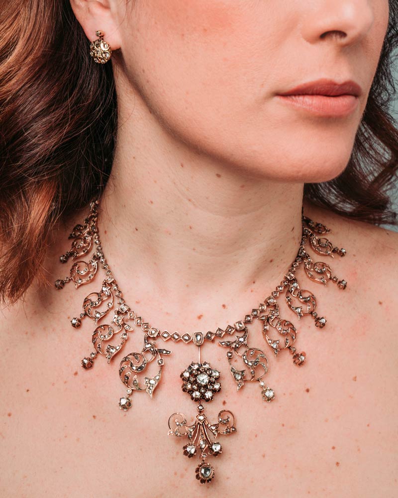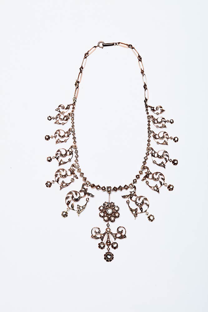 Collier artigianale realizzato in Italia a fine '800 in oro giallo K 14 e diamanti taglio antico e tagloi rosa coronè di 15 ct. Totali. Lunghezza 41 cm, altezza pendente centrale 75 mm, peso 82,88 gr.