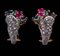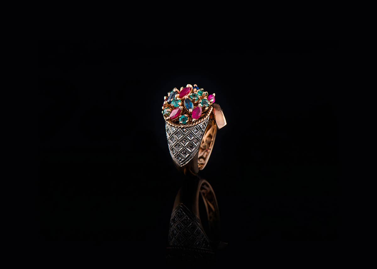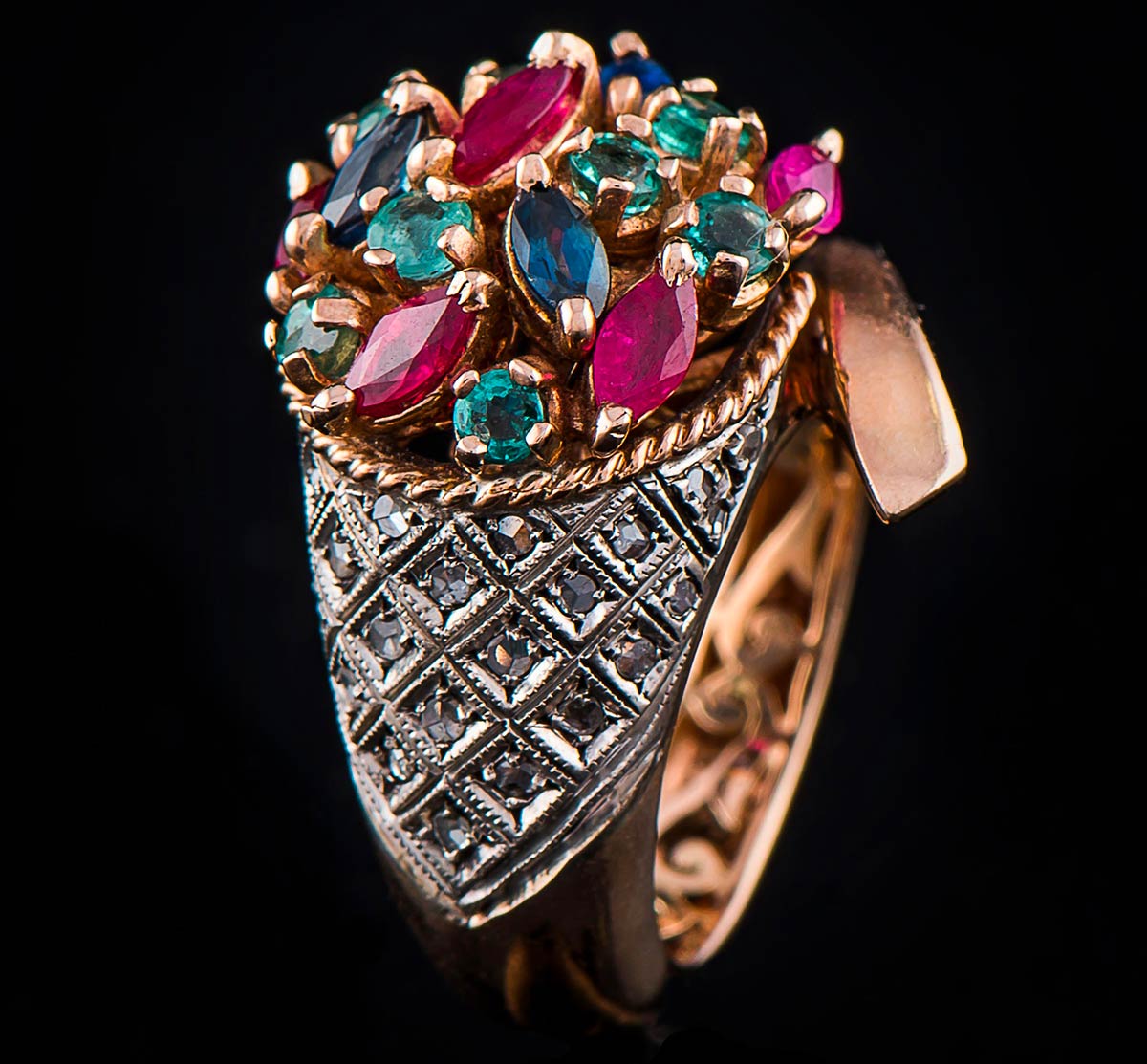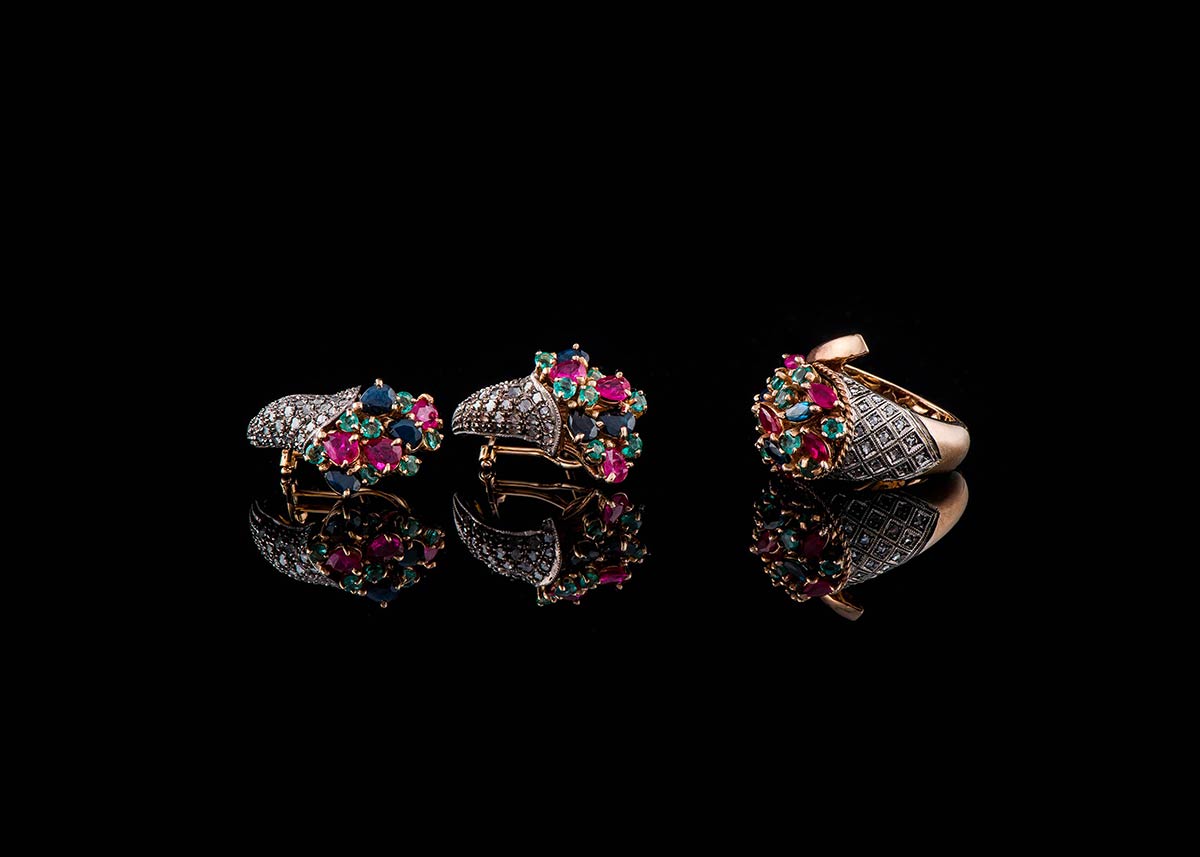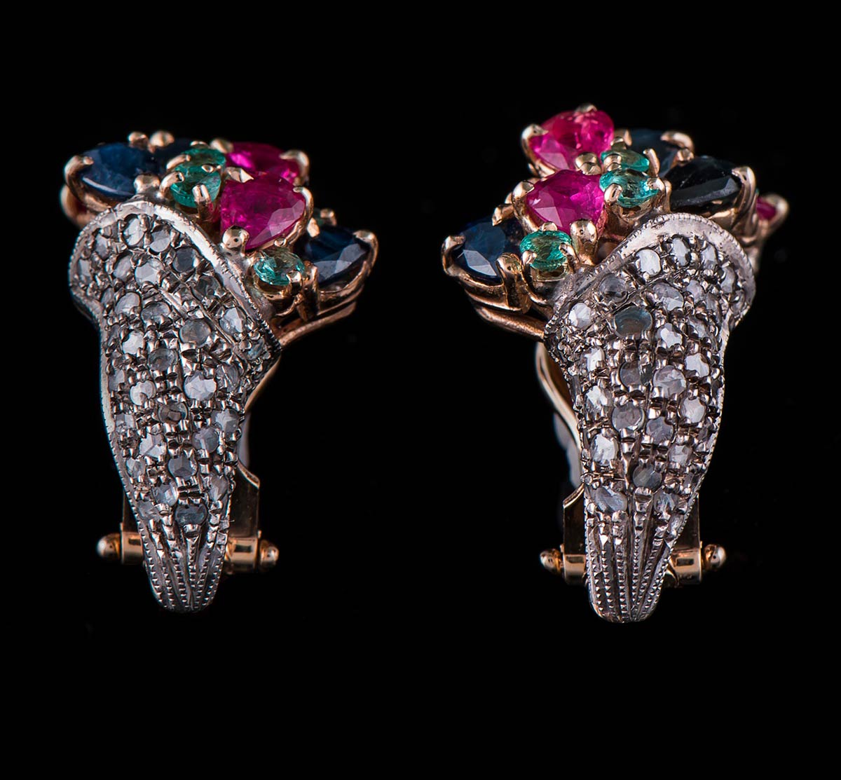 Parure artigianale realizzata in Italia negli anni '40 composta da anello e orecchini in oro giallo K 14 e sottile lamina in argento a copertura dei castoni dei diamanti. I gioielli, realizzati a forma di cornucopia, sono impreziositi da diamanti, rubini, zaffiri e smeraldi. L'anello: diamanti 0,60 ct, rubini, zaffiri e smeraldi per un totale di 2 ct. Misura IT 17,5 (18 mm). Gli orecchini: diamanti 0,90 ct, rubini,zaffiri e smeraldi per un totale di 3,10 ct. 26x15,9 mm. Peso 13,1 gr. La cornucopia è un simbolo di prosperità, abbondanza e fertilità.
