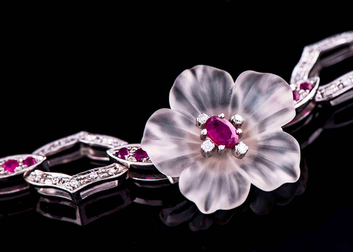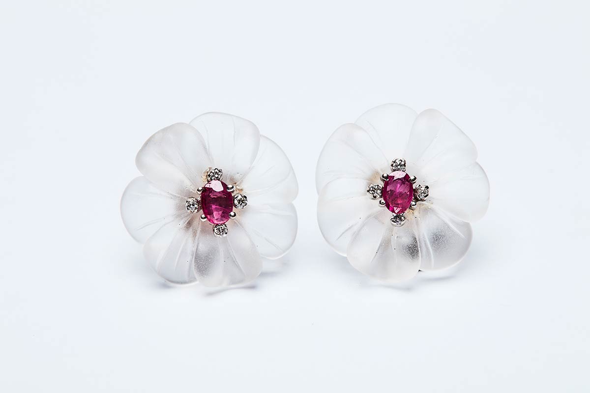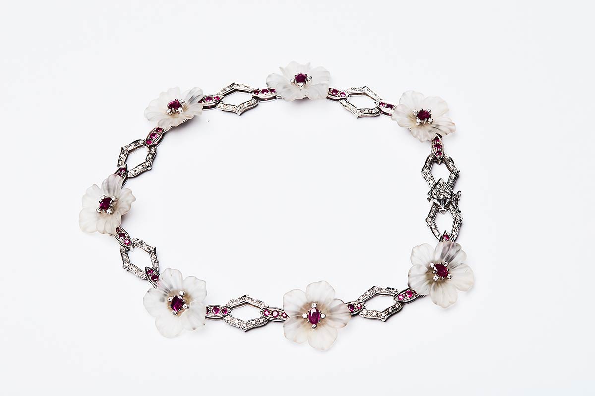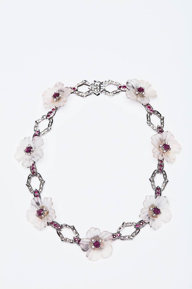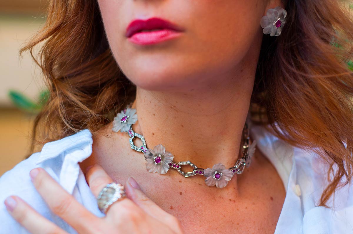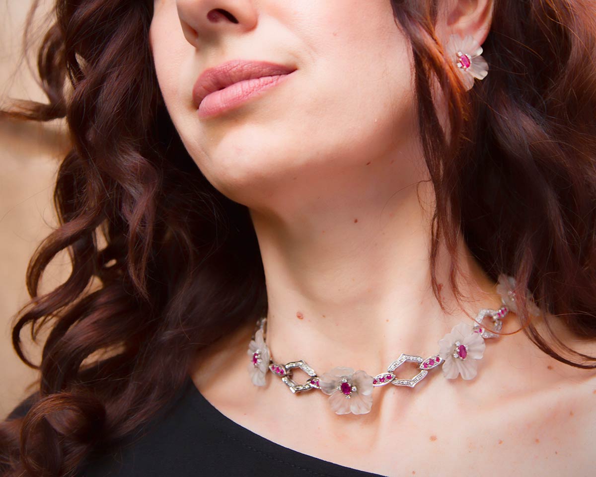 Parure artigianale realizzata in Italia negli anni '50 in oro bianco K 18, composta da orecchini e collier. I gioielli sono realizzati a motivi floreali con pervinche bianche dai petali di cristallo di rocca inciso centrate da rubini contornati di brillanti. Gli orecchini: 25 mm, peso 17,8 gr.Il collier:, lunghezza 37 cm, peso 66,10 gr. Caratura pietre: brillanti 3 ct, rubini 17 ct. La pervinca è simbolo di armonia spirituale e fedeltà nei rapporti.
