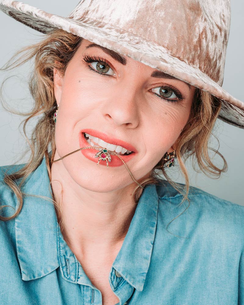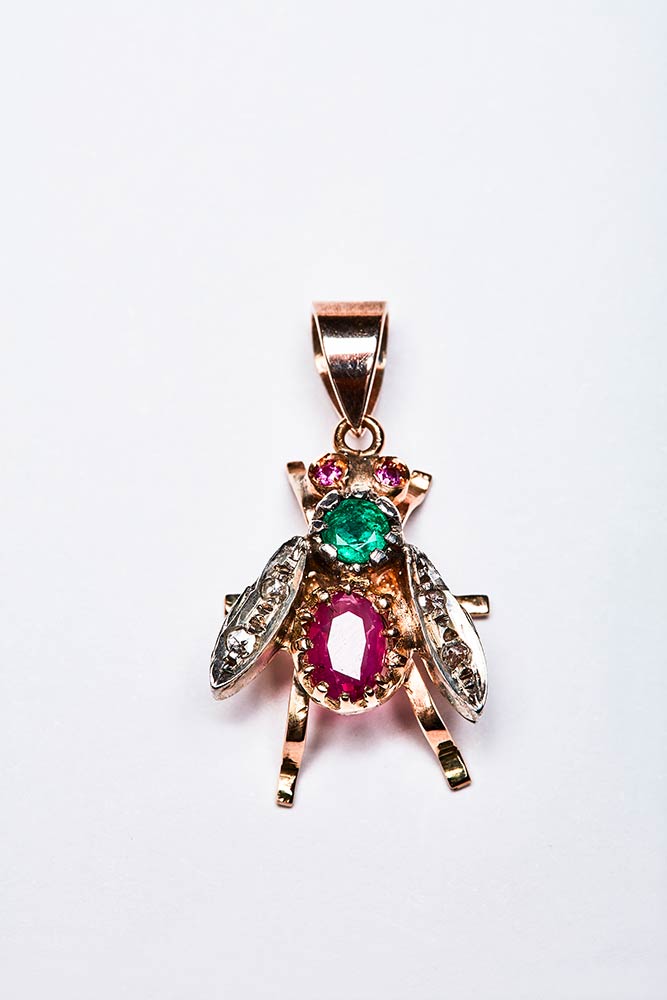 Pendente artigianale realizzato in Italia negli anni '40 in oro giallo K 14. Il pendente raffigura una mosca con occhi di rubini, corpo centrale di smeraldo seguito da un rubino ovale e, ali di diamanti taglio antico di 0,05 ct. Caratura rubini e smeraldi: 1 ct. Misure 20,4x15 mm, peso 3,3 gr.