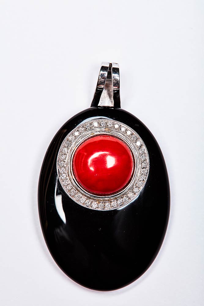 Pendente artigianale realizzato in Italia nel periodo decò in oro bianco K 18. Il pendente, a forma di elisse, è formato da onice di 6,40 gr. e corallo mediterraneo (Corallium Rubrum) cabochon di 1ct., contornato da brillanti di 0,20 ct. Misure 35,82x24,86 mm, peso 12,50 gr. Il lotto è accompagnato da certificato Ce.Sa.R. Questo lotto contiene avorio/corallo/tartaruga o altre specie protette dalla regolamentazione CITES (the Convention on International Trade in Endangered Species of Wild Fauna and Flora).