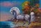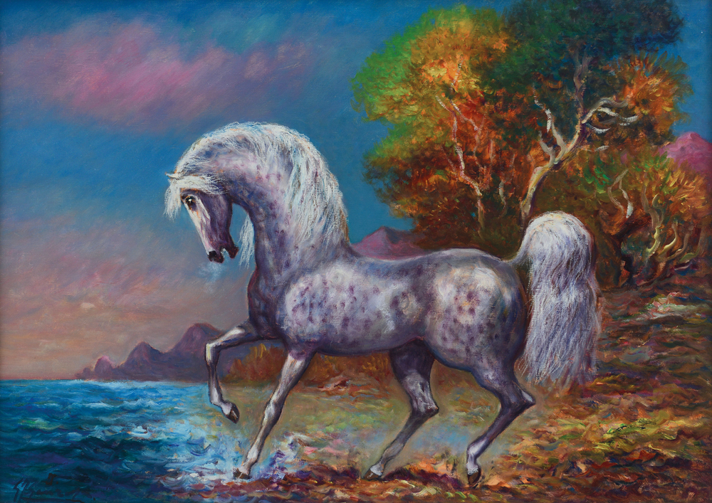 GIOVANFRANCESCO GONZAGA Milano 12/06/1921 - Milano 02/10/2007 Corsiero sulla riva del mare, 1971 olio su tela cm. 50x70, firma in basso a sinistra, titolo, firma e anno al retro, dichiarazione d'autenticità dell'artista e archivio a cura della Galleria Il Salotto (MI) su foto.