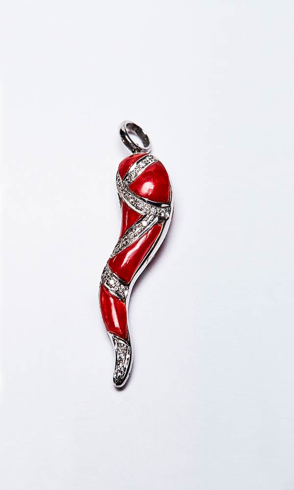 Pendente artigianale realizzato in italia negli anni '40 in oro bianco K 18 e segmenti di corallo rosso mediterraneo (Corallium Rubrum) di 3 ct. A forma di cornetto avvolto la linee di brillanti di 1,10 ct, il pendente viene utilizzato come portafortuna. Lunghezza 42 mm, peso 3,51 gr. Il lotto è accompagnato da certificato Ce.Sa.R. Questo lotto contiene avorio/corallo/tartaruga o altre specie protette dalla regolamentazione CITES (the Convention on International Trade in Endangered Species of Wild Fauna and Flora).