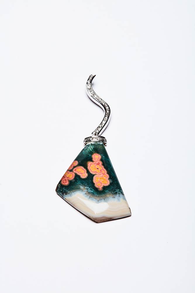 Pendente artigianale realizzato in Italia negli anni '90 in oro bianco K 14. Il pendente è formato da una linea ondulata di brillanti di 0.60 ct da cui pende una pietra di atlantide nota come diaspro oceano. Si pensa che la pietra abbia proprietà che accrescono la conoscenza e aiutano nel cambiamento. Misure 71,7x31,6 mm, peso 14,50 gr.