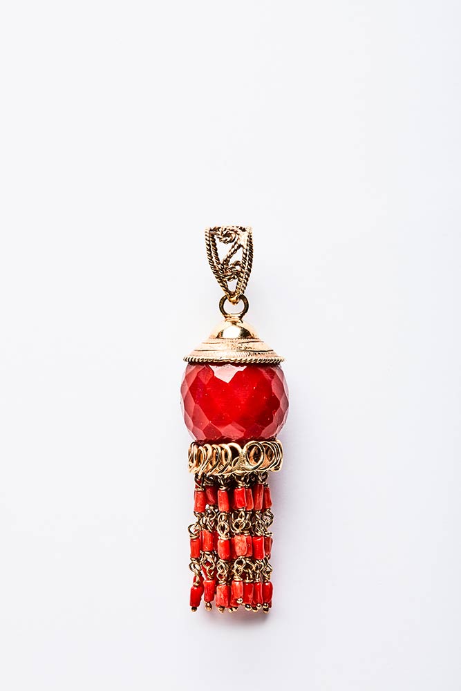 Pendente artigianale realizzato in Italia negli anni '40 in oro giallo K 14 e corallo cerasuolo sfaccettato rosso con sfumature arancio. Misure 73x20,2 mm, peso 22,23 gr. Il lotto è accompagnato da certificato Ce.Sa.R. Questo lotto contiene avorio/corallo/tartaruga o altre specie protette dalla regolamentazione CITES (the Convention on International Trade in Endangered Species of Wild Fauna and Flora).