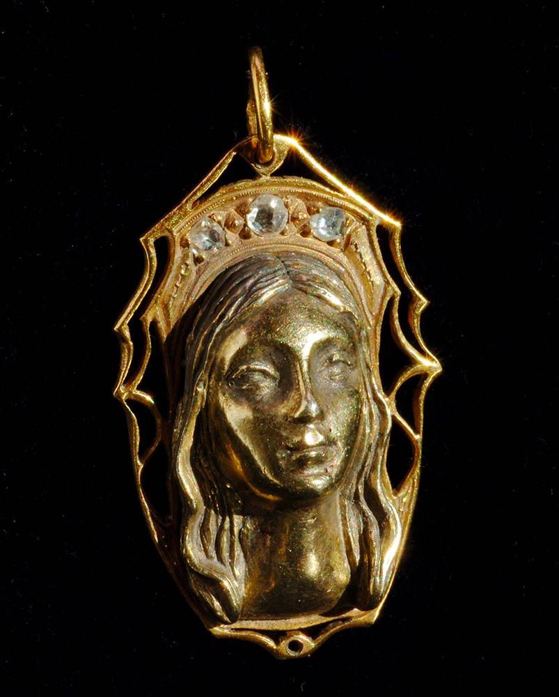 Pendente artigianale realizzato in Italia nei primi anni del '900 in oro giallo K 18 e diamanti taglio antico di 0,15 ct. Misura 38,5x21,6 mm, peso 12 gr.