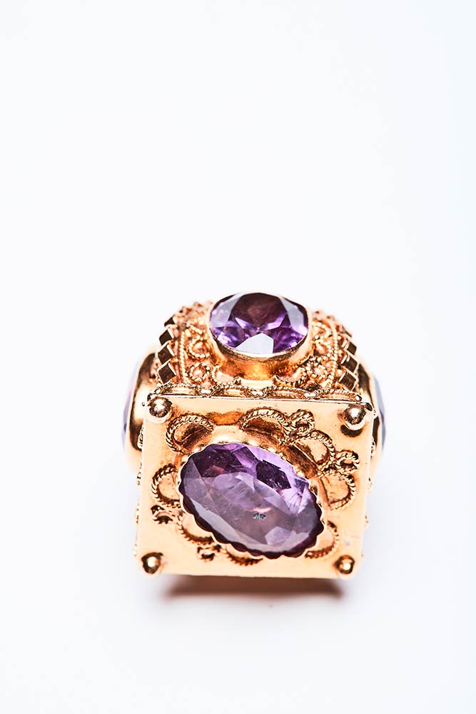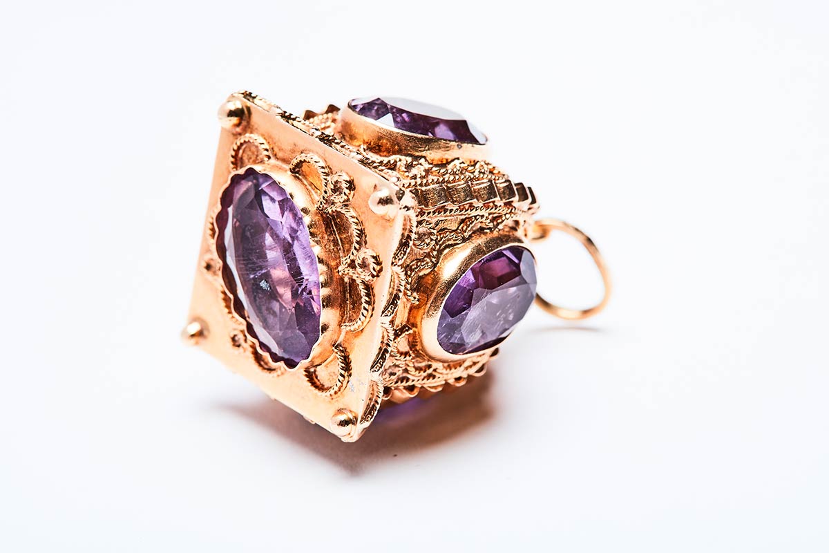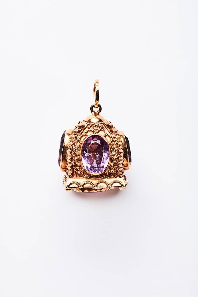 Pendente artigianale realizzato in Italia nei primi anni del '900 in oro giallo K 18, finemente lavorato, e ametiste ovali di 25 ct, disposte su tutti i lati. Misure 29,3x25,3 mm, peso 17,20 gr. La lanterna sta a simboleggiare l'illuminazione dell'oscurità tramite l'intuito.