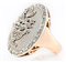 Anello artigianale realizzato in Italia nel periodo libery in oro giallo K 14 e sottile lamina in argento a copertura dei castoni dei diamanti. Centrale in cristallo di rocca circondato da diamanti e decorato con vaso di fiori impreziositi da diamanti taglio antico per un totale di 0,40 ct. Cristallo di rocca 1,60 gr. Misura IT 16, 26,7x20,4 mm, peso 12,10 gr.