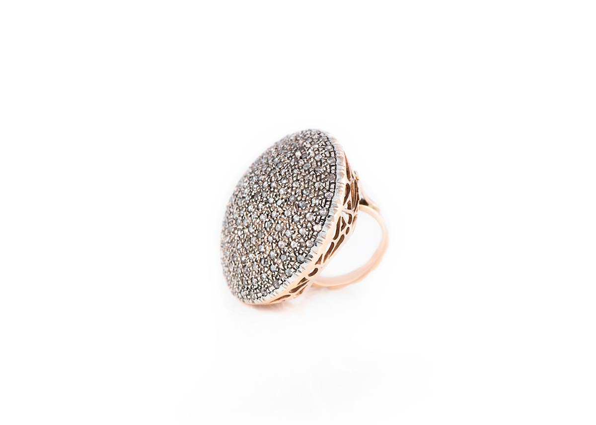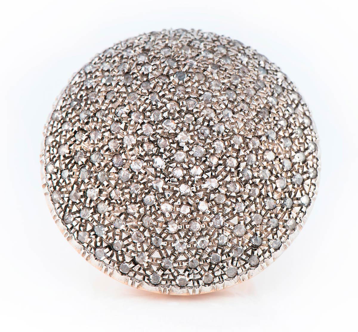 Anello artigianale realizzato in Italia nel periodo decò in oro giallo K 14 e sottile lamina in argento a copertura dei castoni dei diamanti. Centrale con pavè di diamanti taglio antico di 3 ct. Misura IT 14, diametro 35,9 mm, peso 26,15 gr.