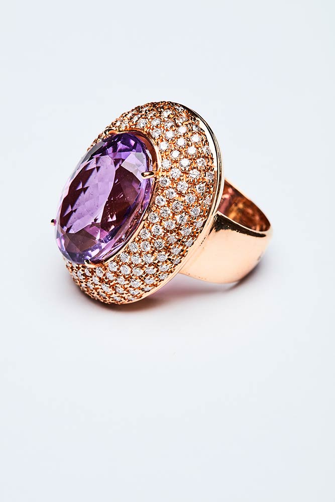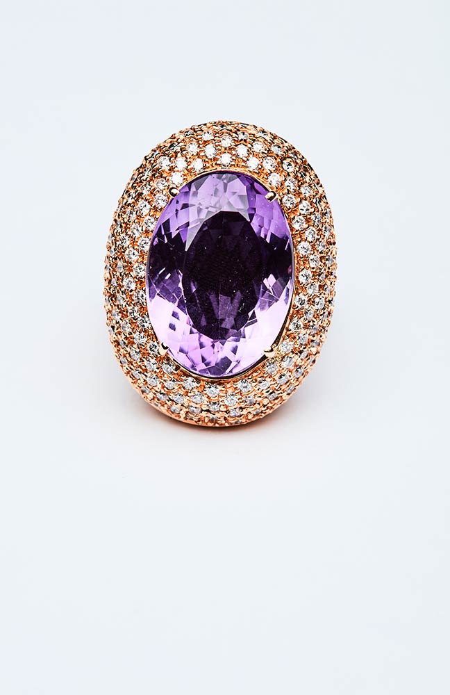 Anello artigianale realizzato in Italia negli anni ‘70 in oro giallo K 14 con pavé di diamanti di 1,80 ct e ametista centrale di forma ovale di 16 ct. Misura IT 17, 30x23 mm; peso 16,38 gr.