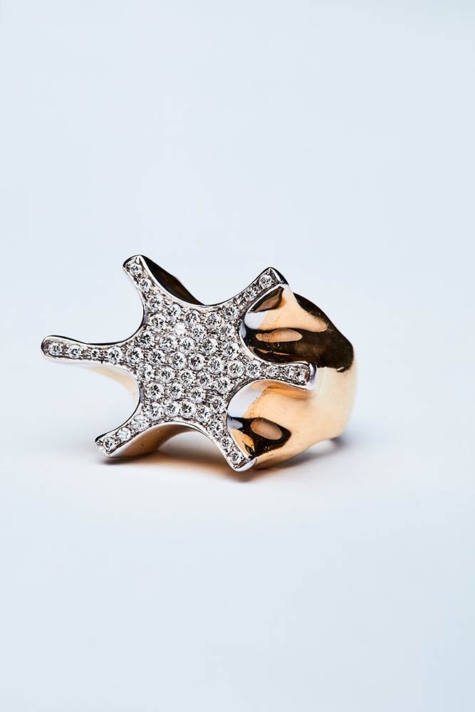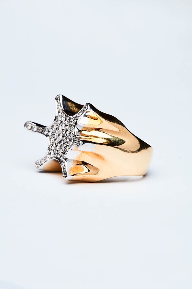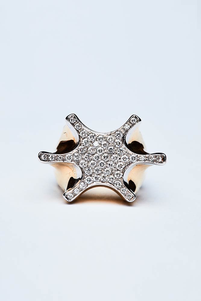 Anello artigianale realizzato in Italia negli anni ’70 in oro giallo e bianco K 18 e brillanti di 1 ct a formare una stella anomala. Misura IT 16, 20,15x29 mm; peso 23,37 gr.