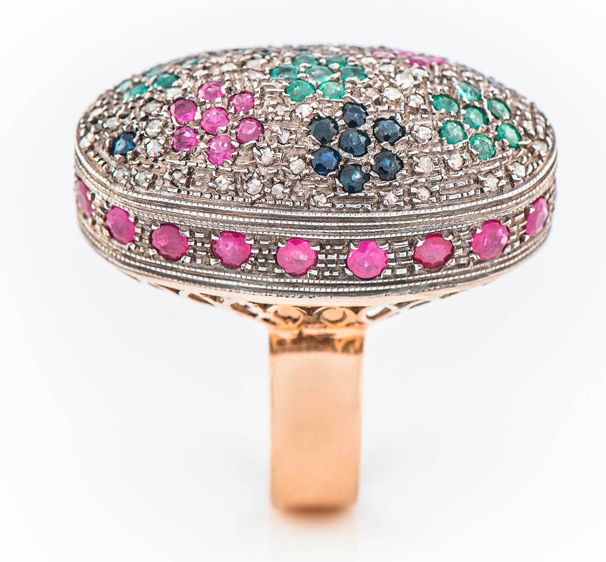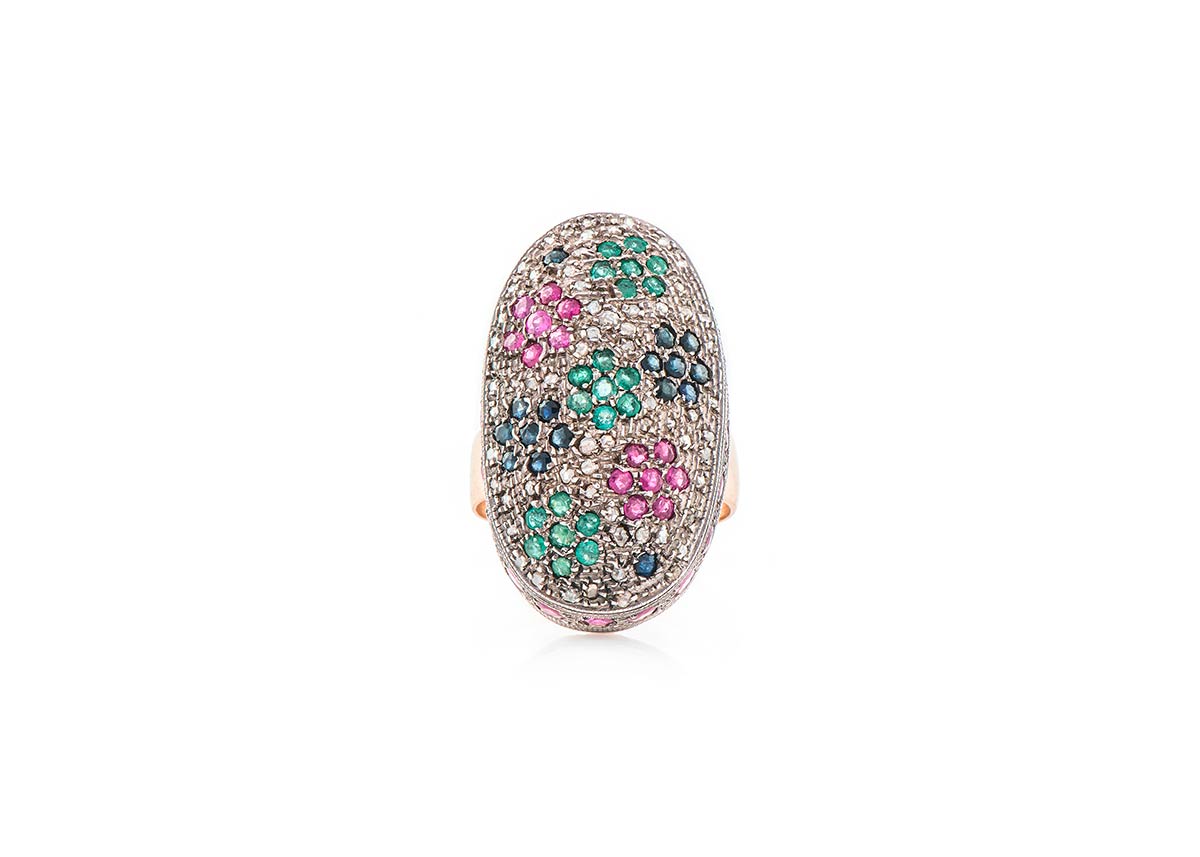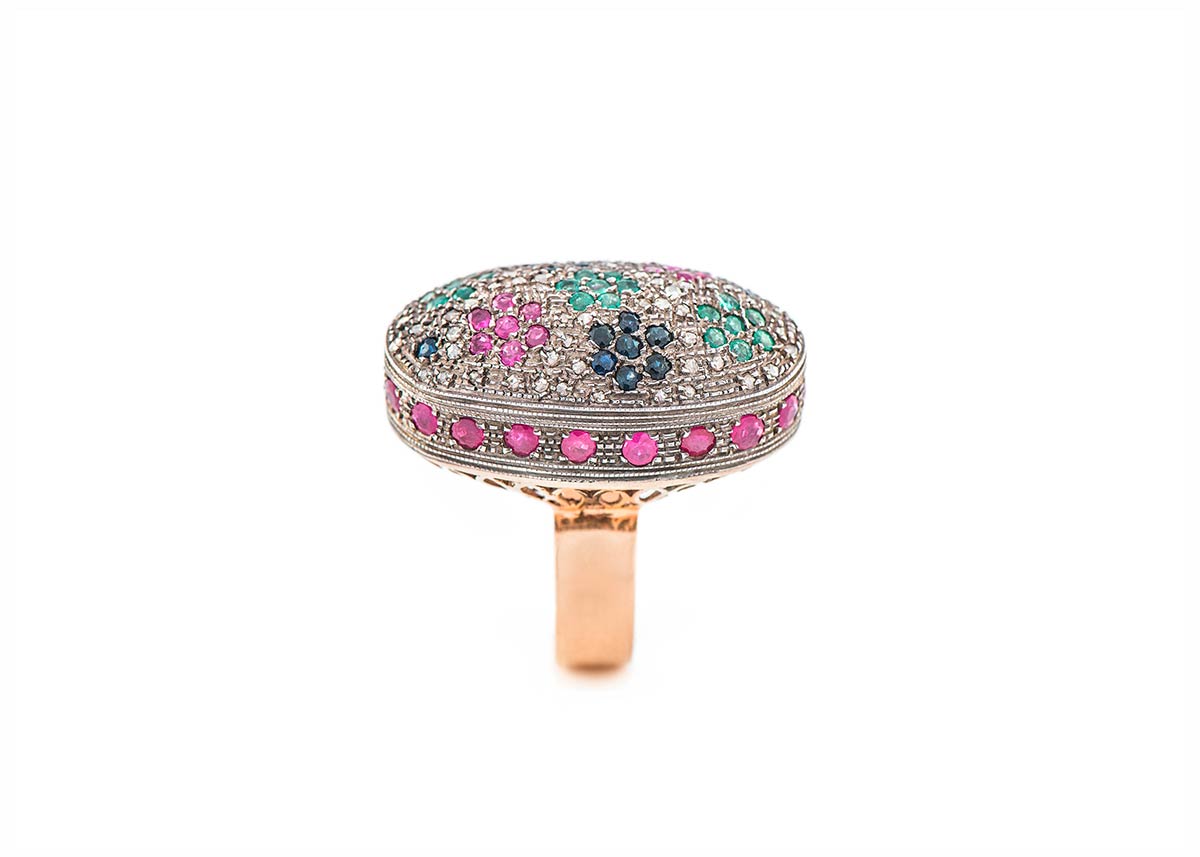 Anello artigianale realizzato in Italia negli anni ’40 in oro giallo K 14 e sottile lamina in argento a copertura dei castoni dei diamanti. Il centrale di forma ovale tempestato di diamanti rose coronè di 1,20 ct è decorato da fiorellini realizzati in rubini di 7,5 ct, zaffiri di 0,90 ct e smeraldi di 1,30 ct. Misura IT 27, 37,7x22,7 mm, peso 18,90 gr.