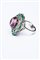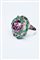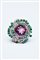 Anello artigianale realizzato in Italia negli anni ‘50 in oro bianco K 14. A forma di bocciolo con ametista centrale di 10 ct circondata da smeraldi rotondi di 2 ct e diamanti di 1 ct. Misura IT 17, 31 mm; peso 18,35 gr.