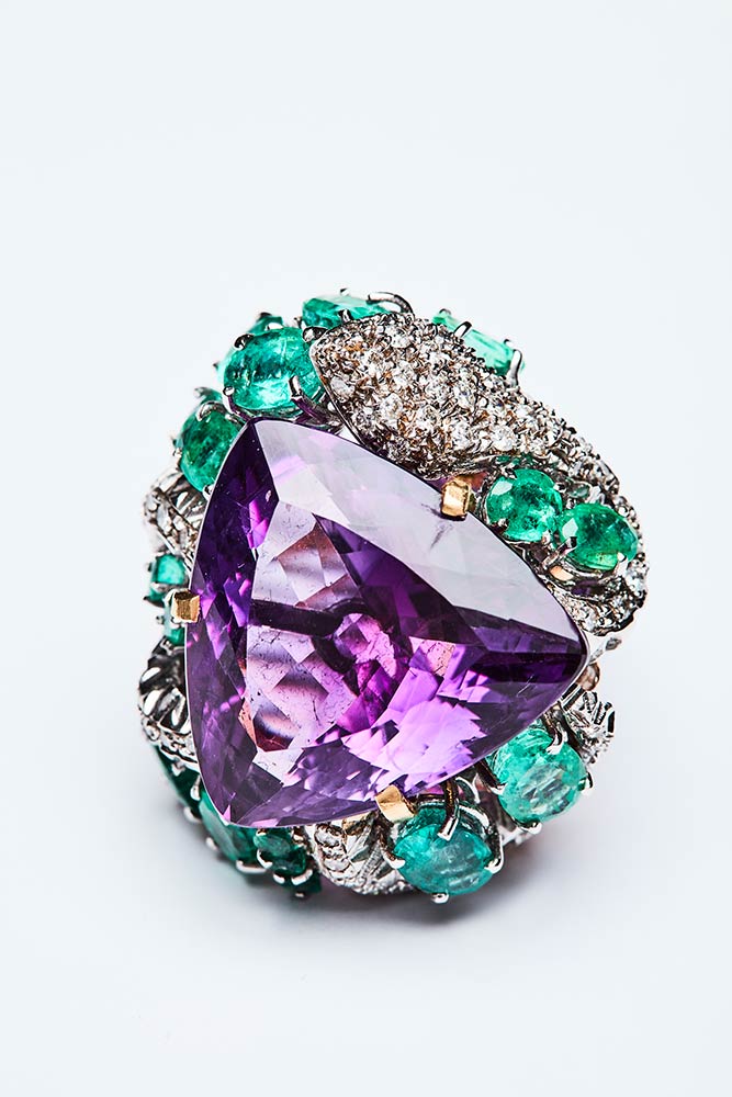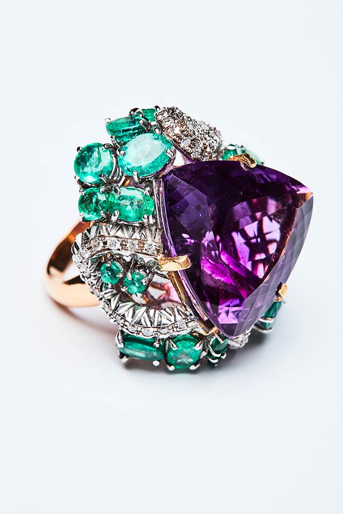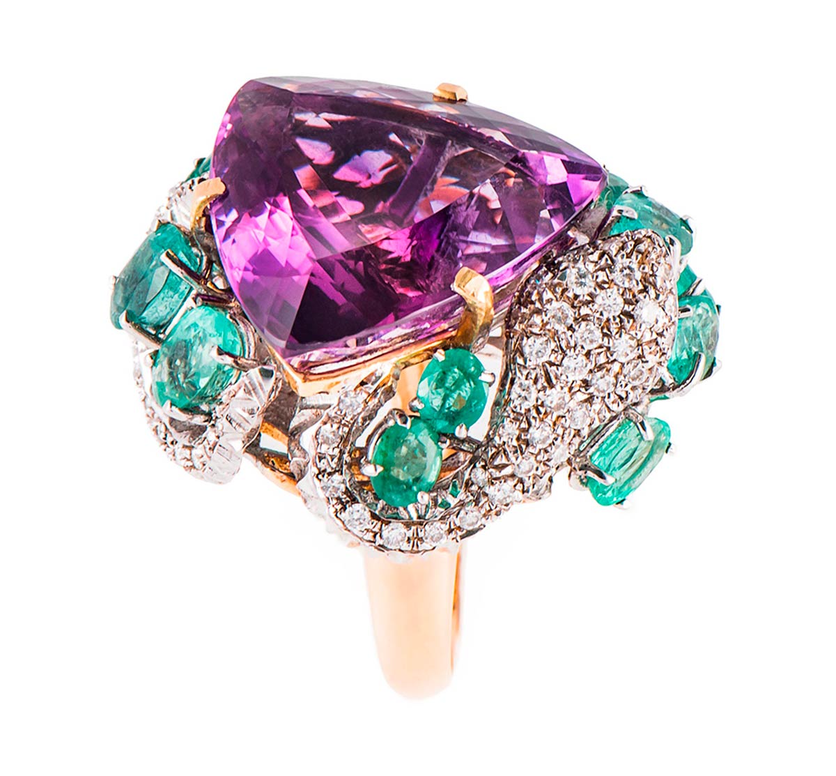 Anello artigianale realizzato in Italia negli anni '40 in oro giallo e bianco K 18 . Serpente tempestato di brillanti di 1,30 ct avviluppato ad una ametista centrale taglio trilland di 35 ct. Smeraldi tondi ed ovali di 9 ct ad impreziosire il tutto. Misura IT 19, 34,4x29 mm; peso 28,61 gr.